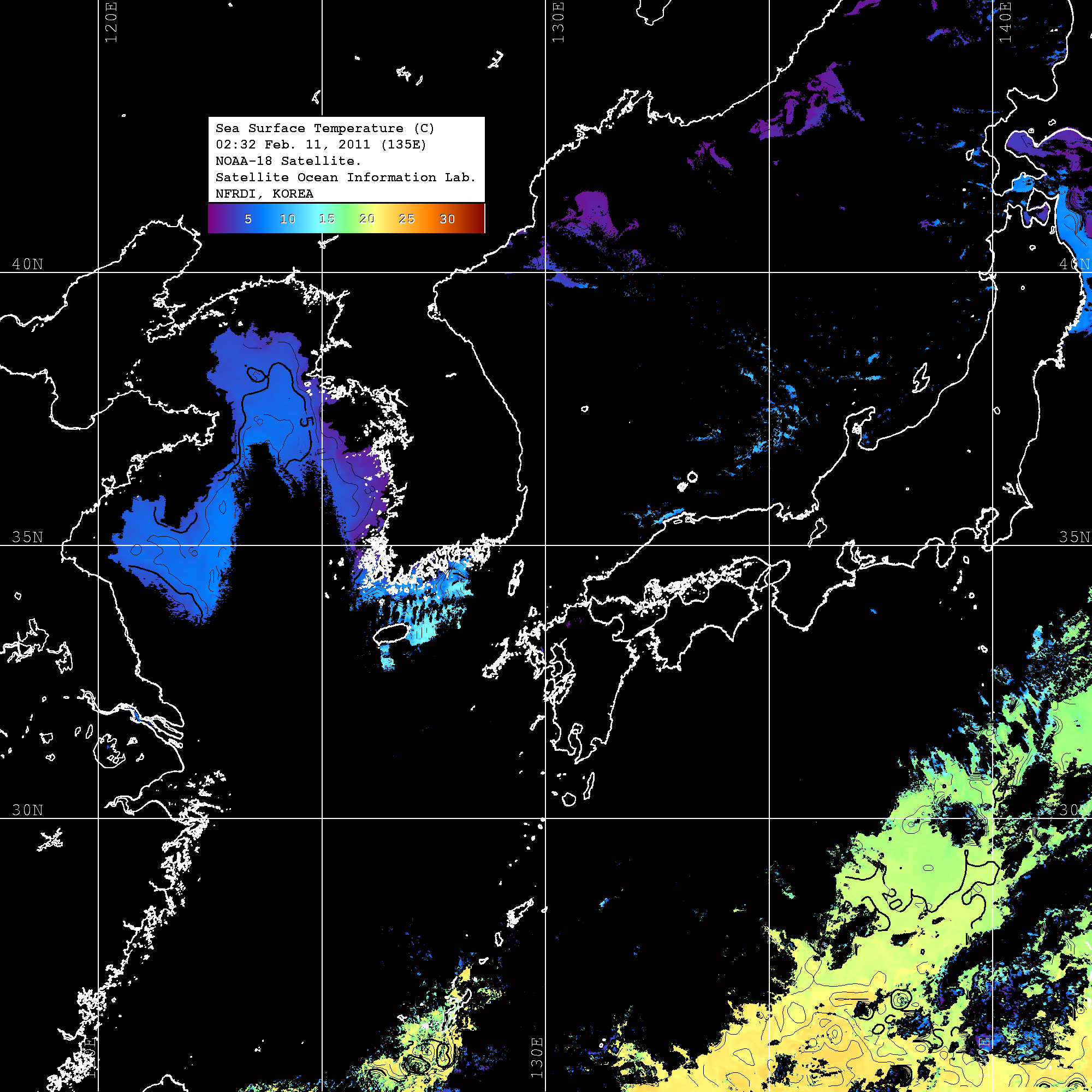 o 2011년 02월 11일 02시 32분 NOAA-18호 위성영상입니다. o 수온분포는 범례를 참고하시기 바랍니다. o 검은색은 구름을 나타냅니다. o 그림을 클릭하시면 크게 보실 수 있습니다.