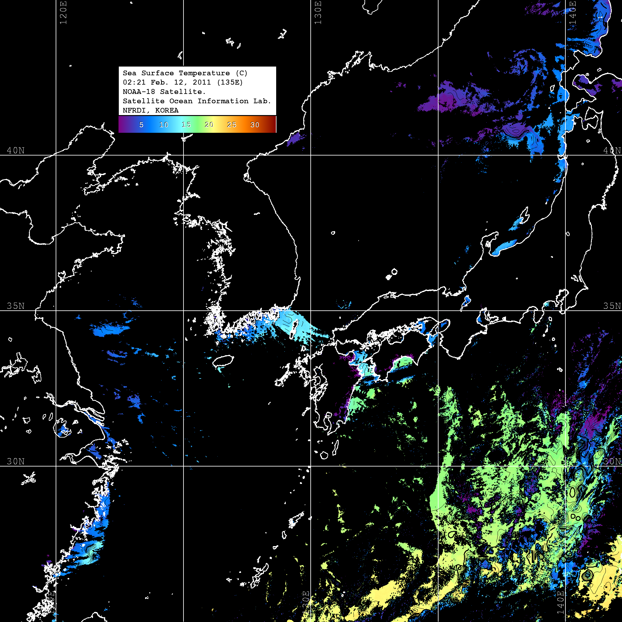 o 2011년 02월 12일 02시 21분 NOAA-18호 위성영상입니다. o 수온분포는 범례를 참고하시기 바랍니다. o 검은색은 구름을 나타냅니다. o 그림을 클릭하시면 크게 보실 수 있습니다.