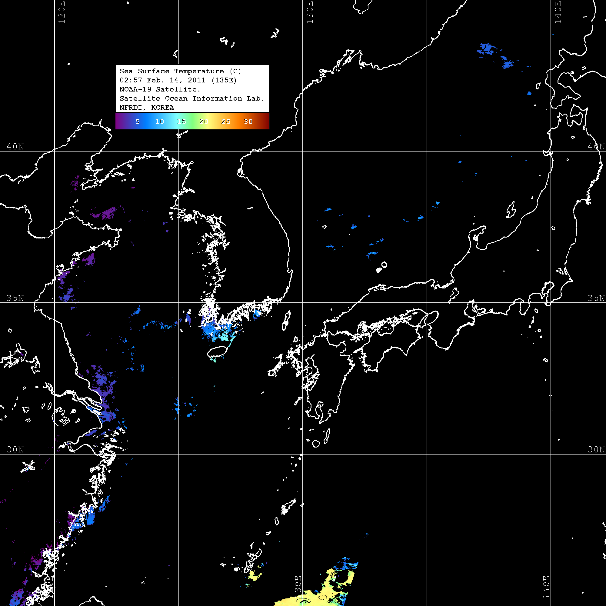 o 2011년 02월 14일 02시 57분 NOAA-19호 위성영상입니다. o 수온분포는 범례를 참고하시기 바랍니다. o 검은색은 구름을 나타냅니다. o 그림을 클릭하시면 크게 보실 수 있습니다.