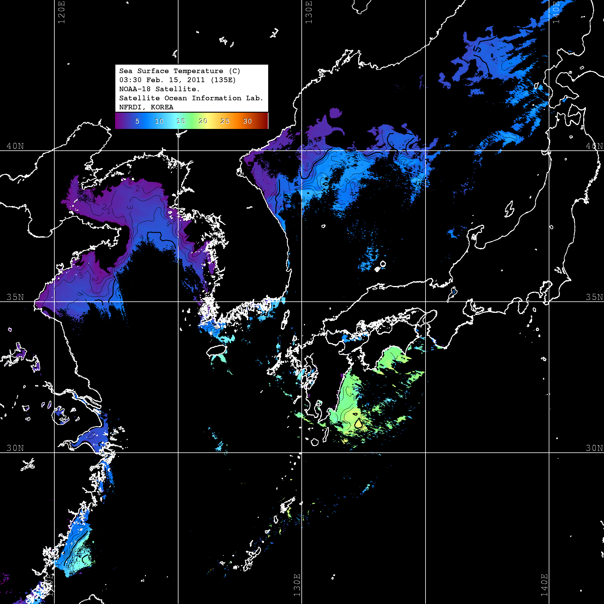 o 2011년 02월 15일 03시 30분 NOAA-18호 위성영상입니다. o 수온분포는 범례를 참고하시기 바랍니다. o 검은색은 구름을 나타냅니다. o 그림을 클릭하시면 크게 보실 수 있습니다.