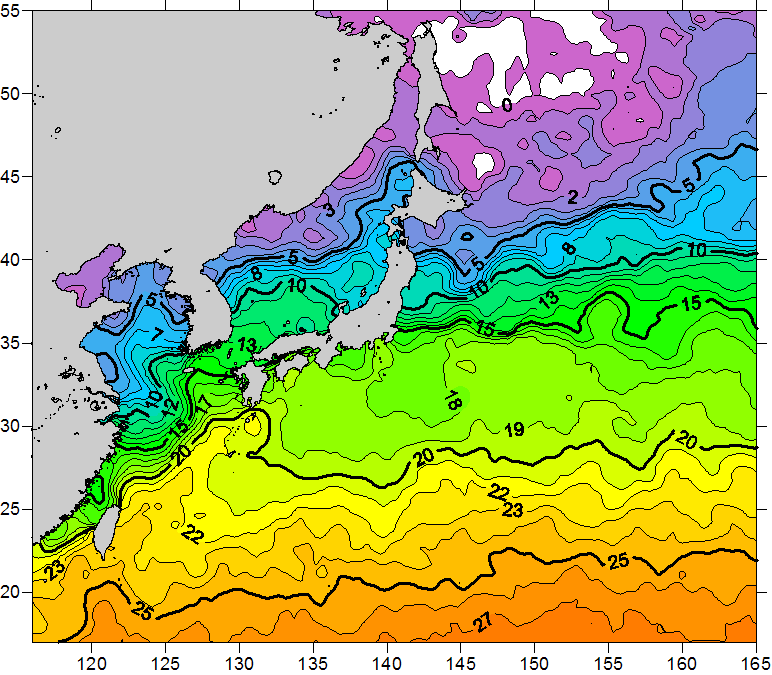 o 2011년 02월 15일 북서태평양 광역해양 수온분포 입니다. o 아래 위성 수온분포도는 국립수산과학원(NFRDI, Korea)과 일본동북대학교 (Tohoku University, Japan)가 공동연구개발 진행중, 1차 연구결과인 것으로 구름의 영향을 배제한 신기술의 수온정보입니다.