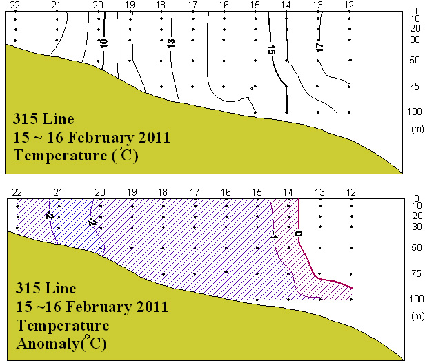 ㅇ 2011년 2월 15 ~ 16일 국립수산과학원 남서해 수산 연구소에서 조사한 동중국해 북부해역(315선)의 수온 수직분포도와 평년편차도입니다.