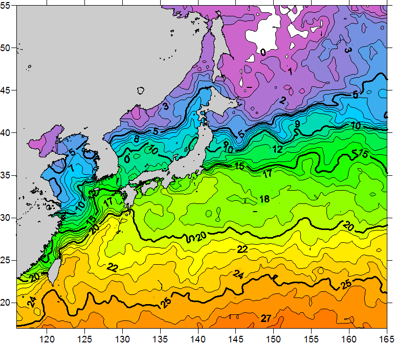 o 2011년 02월 18일 북서태평양 광역해양 수온분포 입니다. o 아래 위성 수온분포도는 국립수산과학원(NFRDI, Korea)과 일본동북대학교 (Tohoku University, Japan)가 공동연구개발 진행중, 1차 연구결과인 것으로 구름의 영향을 배제한 신기술의 수온정보입니다.