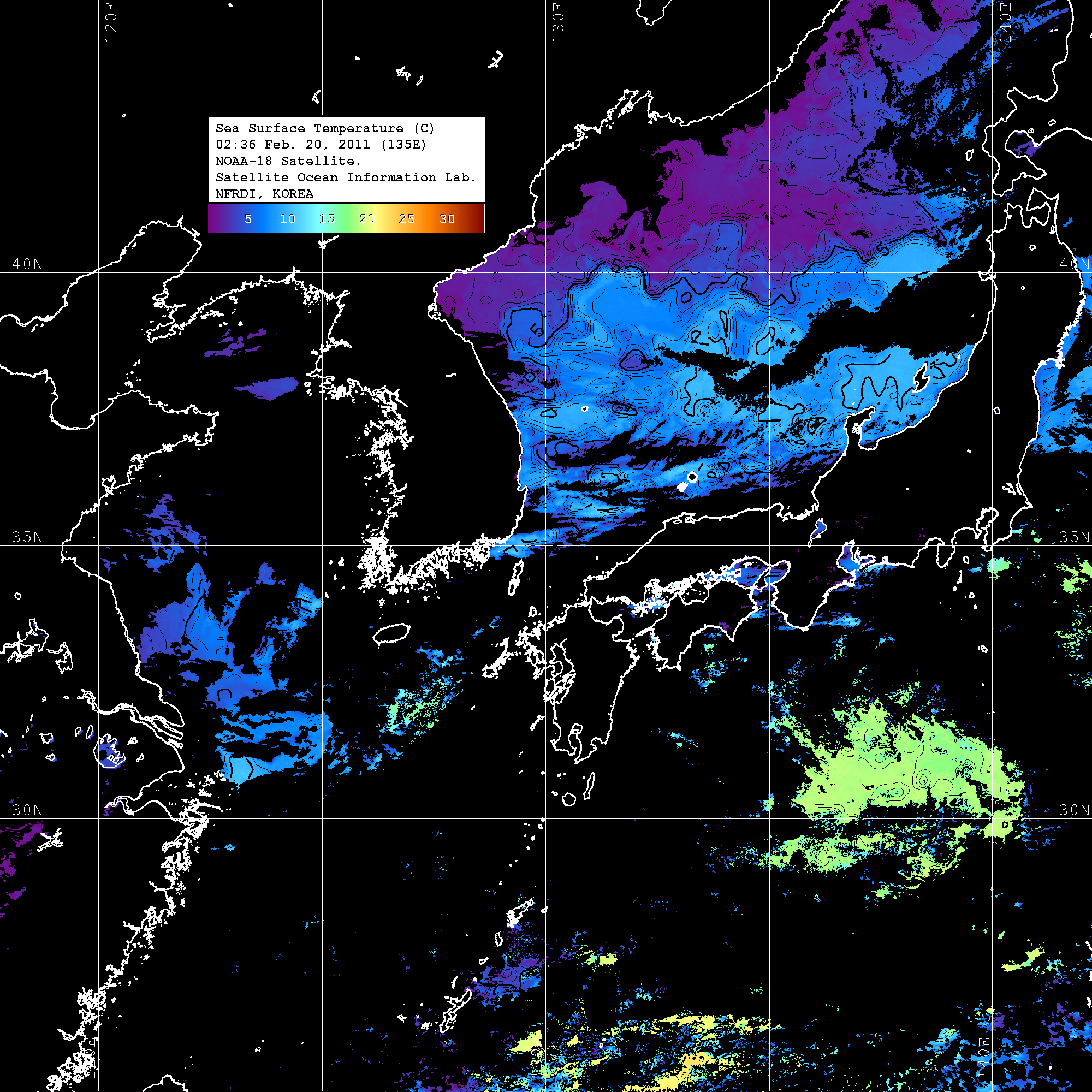 o 2011년 02월 20일 02시 36분 NOAA-18호 위성영상입니다. o 수온분포는 범례를 참고하시기 바랍니다. o 검은색은 구름을 나타냅니다. o 그림을 클릭하시면 크게 보실 수 있습니다.