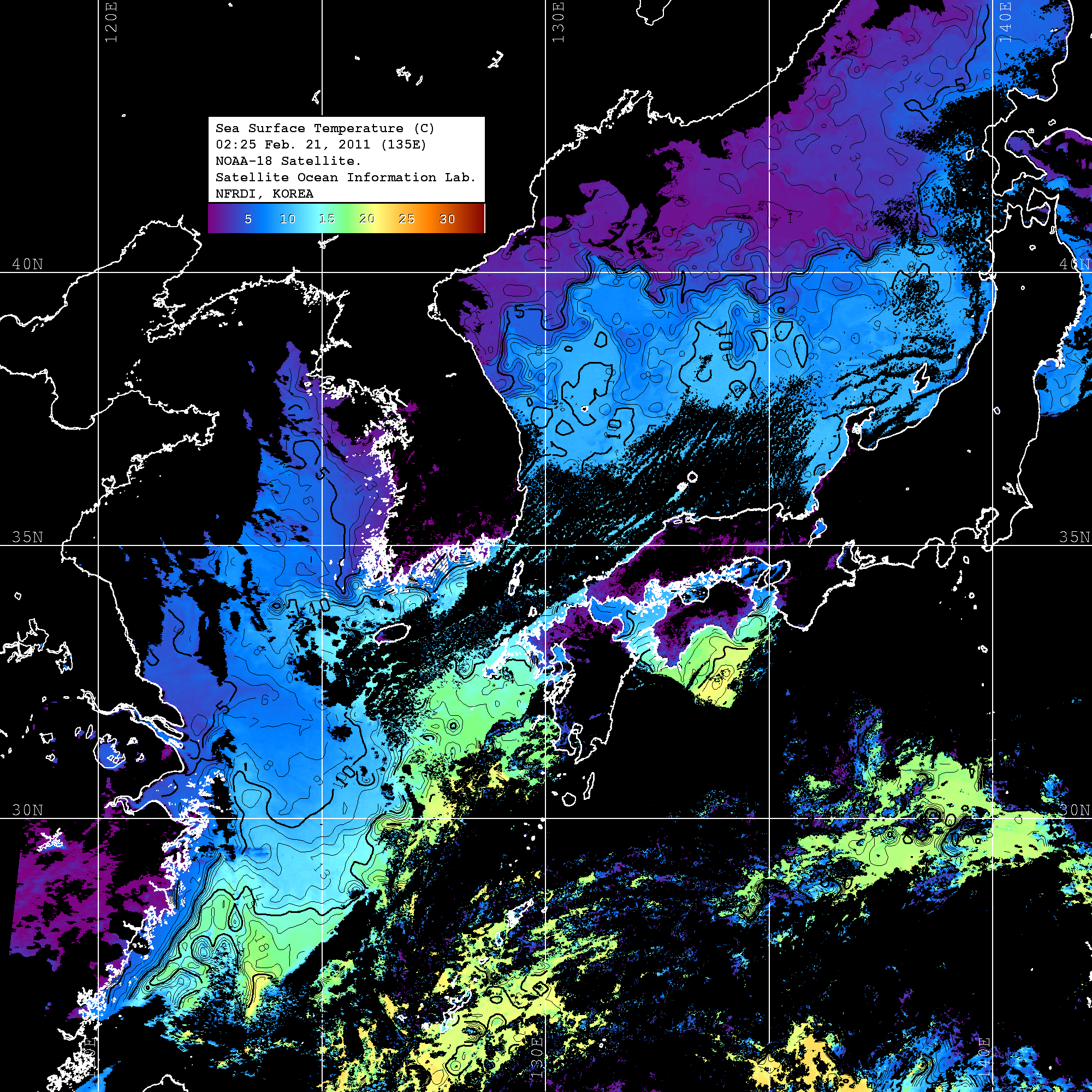 o 2011년 02월 21일 02시 25분 NOAA-18호 위성영상입니다. o 수온분포는 범례를 참고하시기 바랍니다. o 검은색은 구름을 나타냅니다. o 그림을 클릭하시면 크게 보실 수 있습니다.