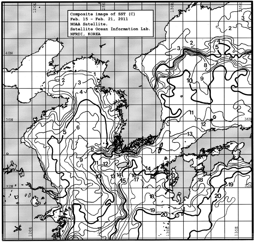 o 금주(2011.02.15~2011.02.21)의 한국근해 표면수온은 대화퇴 근해 5~7도, 울릉도 근해 10~11도, 대마도 근해 12~14도, 제주도 근해 12~14도, 이어도 근해 8~10도, 가거초 근해 10~11도, 어청도 근해 3~4도로 나타납니다. o「평년에 비해」대화퇴 근해 0.8도 낮게, 울릉도 근해 비슷하게, 대마도 근해 1.6도 낮게, 제주도 근해 1.5도 낮게, 이어도 근해 0.6도 낮게, 가거초 근해 0.7도 높게, 어청도 근해는 1.8도 낮게 나타납니다. o「전년에 비해」대화퇴 근해 2.5도 낮게, 울릉도 근해 0.5도 높게, 대마도 근해 2.0도 낮게, 제주도 근해 1.5도 낮게, 이어도 근해 0.5도 낮게, 가거초 근해 1.0도 낮게, 어청도 근해는 2.0도 낮게 나타납니다. o 수온 전선대는 우리나라 제주해협에서 대한해협까지 12도를 중심으로 형성됩니다.