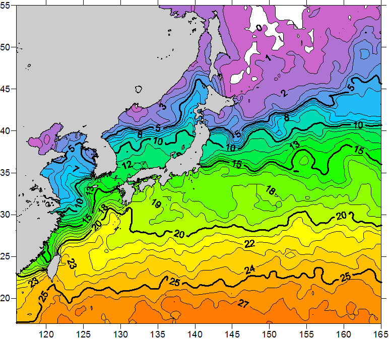 o 2011년 02월 21일 북서태평양 광역해양 수온분포 입니다. o 아래 위성 수온분포도는 국립수산과학원(NFRDI, Korea)과 일본동북대학교 (Tohoku University, Japan)가 공동연구개발 진행중, 1차 연구결과인 것으로 구름의 영향을 배제한 신기술의 수온정보입니다.