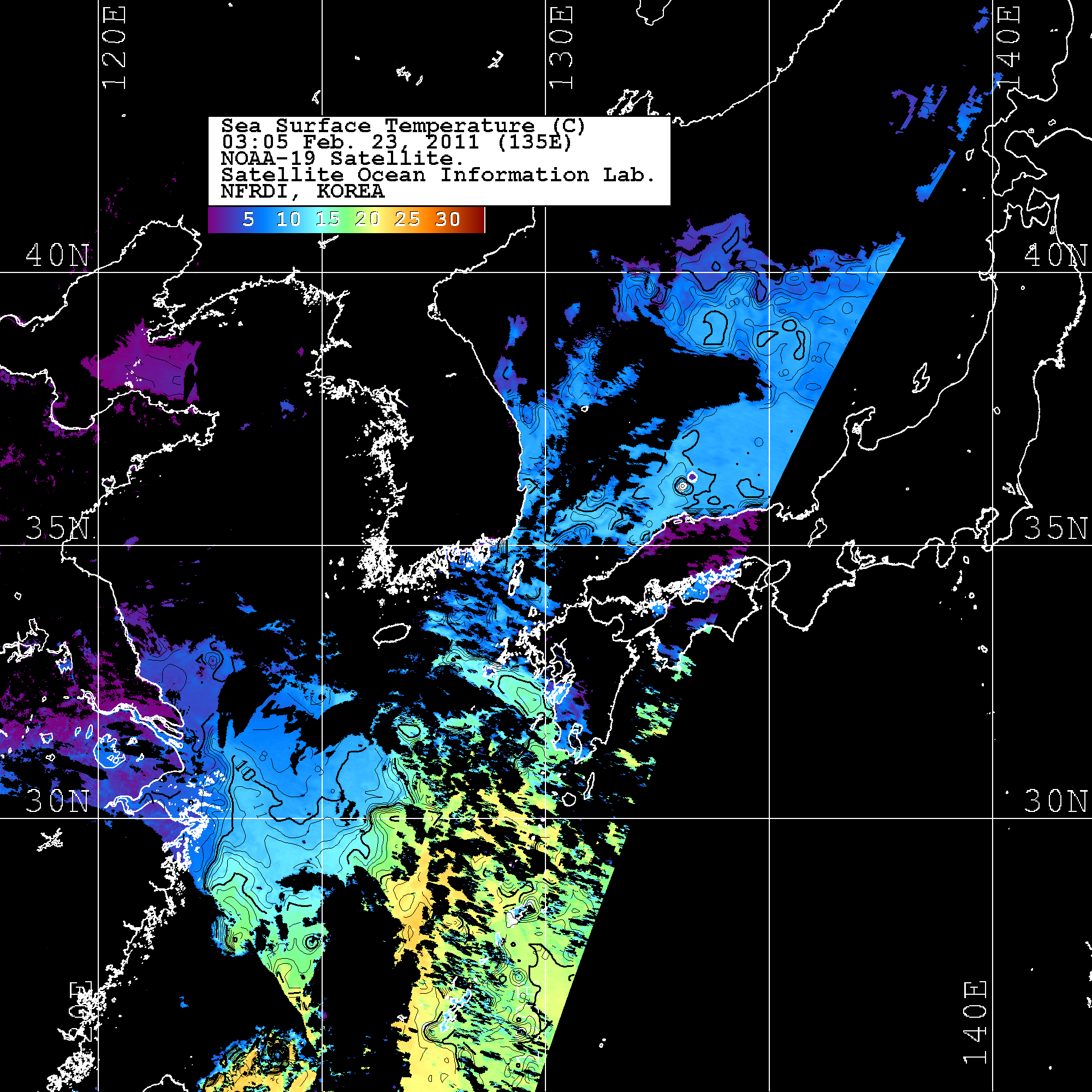 o 2011년 02월 23일 03시 05분 NOAA-19호 위성영상입니다. o 수온분포는 범례를 참고하시기 바랍니다. o 검은색은 구름을 나타냅니다. o 그림을 클릭하시면 크게 보실 수 있습니다.