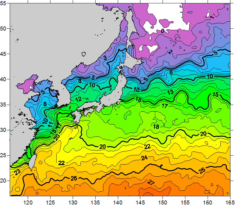 o 2011년 02월 22일 북서태평양 광역해양 수온분포 입니다. o 아래 위성 수온분포도는 국립수산과학원(NFRDI, Korea)과 일본동북대학교 (Tohoku University, Japan)가 공동연구개발 진행중, 1차 연구결과인 것으로 구름의 영향을 배제한 신기술의 수온정보입니다.