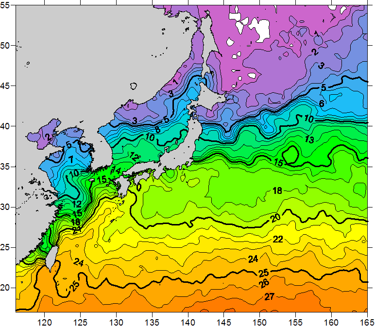 o 2011년 02월 24일 북서태평양 광역해양 수온분포 입니다. o 아래 위성 수온분포도는 국립수산과학원(NFRDI, Korea)과 일본동북대학교 (Tohoku University, Japan)가 공동연구개발 진행중, 1차 연구결과인 것으로 구름의 영향을 배제한 신기술의 수온정보입니다.