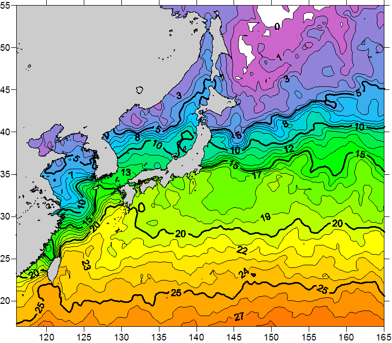 o 2011년 02월 26일 북서태평양 광역해양 수온분포 입니다. o 아래 위성 수온분포도는 국립수산과학원(NFRDI, Korea)과 일본동북대학교 (Tohoku University, Japan)가 공동연구개발 진행중, 1차 연구결과인 것으로 구름의 영향을 배제한 신기술의 수온정보입니다.