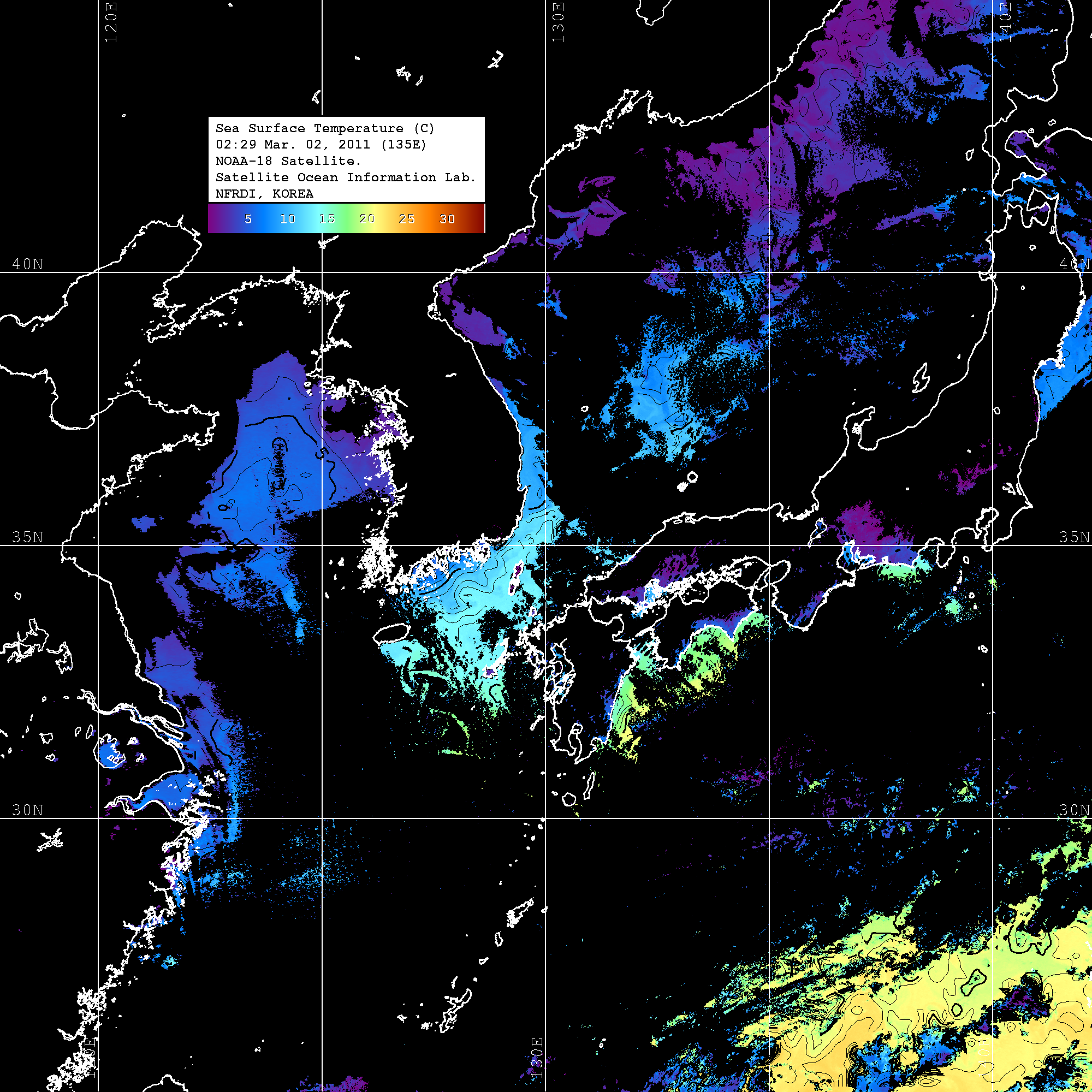 o 2011년 03월 02일 02시 29분 NOAA-18호 위성영상입니다. o 수온분포는 범례를 참고하시기 바랍니다. o 검은색은 구름을 나타냅니다. o 그림을 클릭하시면 크게 보실 수 있습니다.