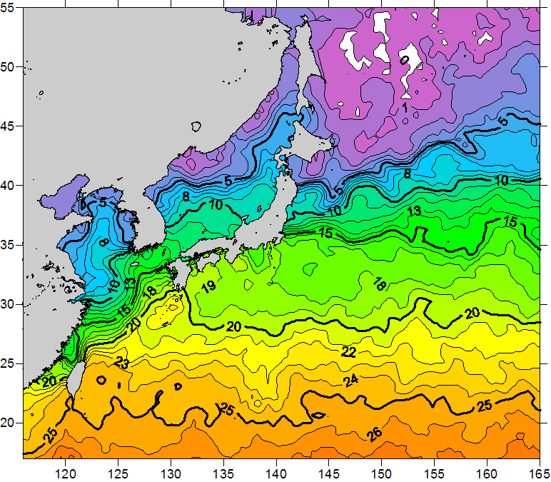 o 2011년 03월 01일 북서태평양 광역해양 수온분포 입니다. o 아래 위성 수온분포도는 국립수산과학원(NFRDI, Korea)과 일본동북대학교 (Tohoku University, Japan)가 공동연구개발 진행중, 1차 연구결과인 것으로 구름의 영향을 배제한 신기술의 수온정보입니다.