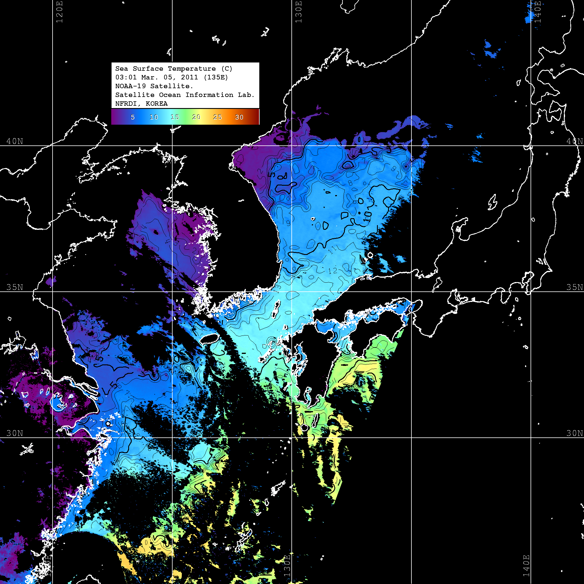 o 2011년 03월 05일 03시 01분 NOAA-19호 위성영상입니다. o 수온분포는 범례를 참고하시기 바랍니다. o 검은색은 구름을 나타냅니다. o 그림을 클릭하시면 크게 보실 수 있습니다.