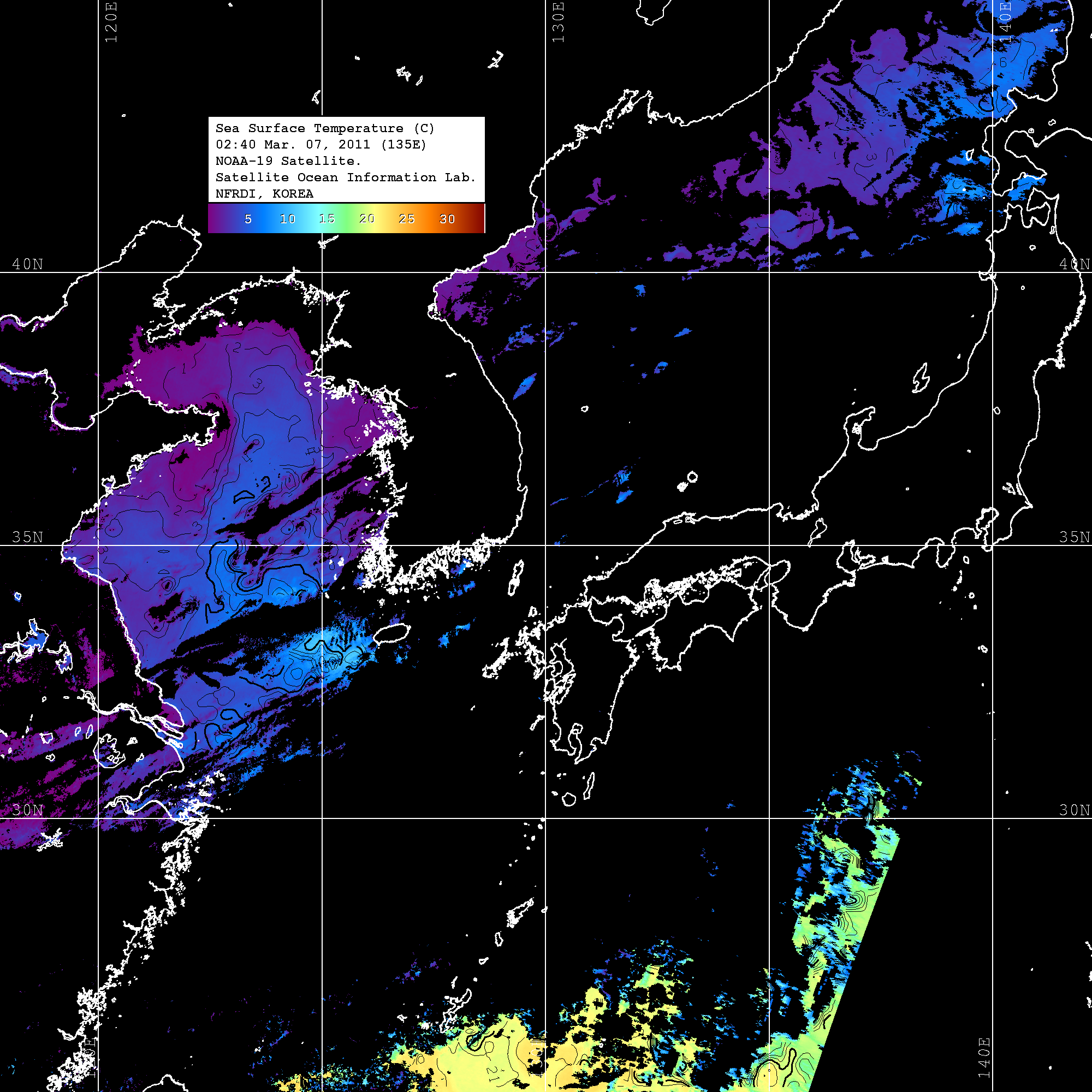 o 2011년 03월 07일 02시 40분 NOAA-19호 위성영상입니다. o 수온분포는 범례를 참고하시기 바랍니다. o 검은색은 구름을 나타냅니다. o 그림을 클릭하시면 크게 보실 수 있습니다.