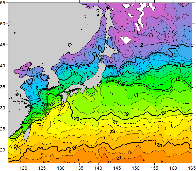 o 2011년 03월 08일 북서태평양 광역해양 수온분포 입니다. o 아래 위성 수온분포도는 국립수산과학원(NFRDI, Korea)과 일본동북대학교 (Tohoku University, Japan)가 공동연구개발 진행중, 1차 연구결과인 것으로 구름의 영향을 배제한 신기술의 수온정보입니다.