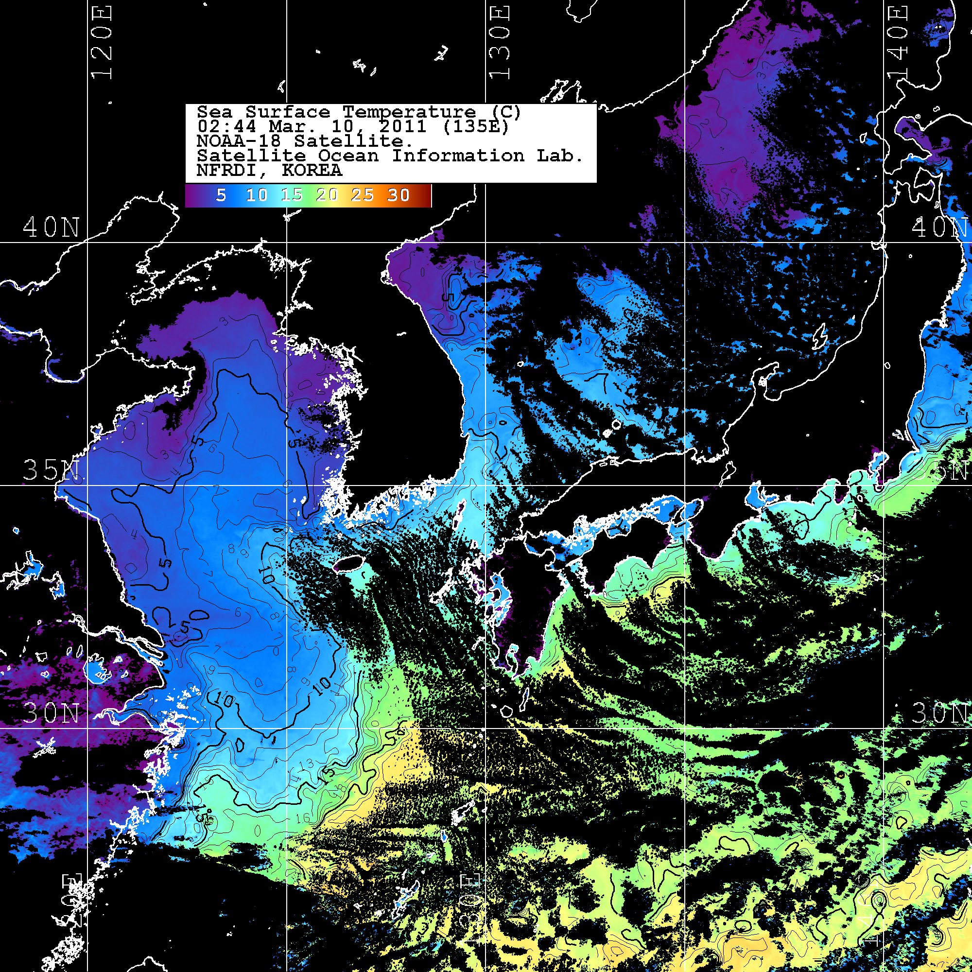 o 2011년 03월 10일 02시 44분 NOAA-18호 위성영상입니다. o 수온분포는 범례를 참고하시기 바랍니다. o 검은색은 구름을 나타냅니다. o 그림을 클릭하시면 크게 보실 수 있습니다.