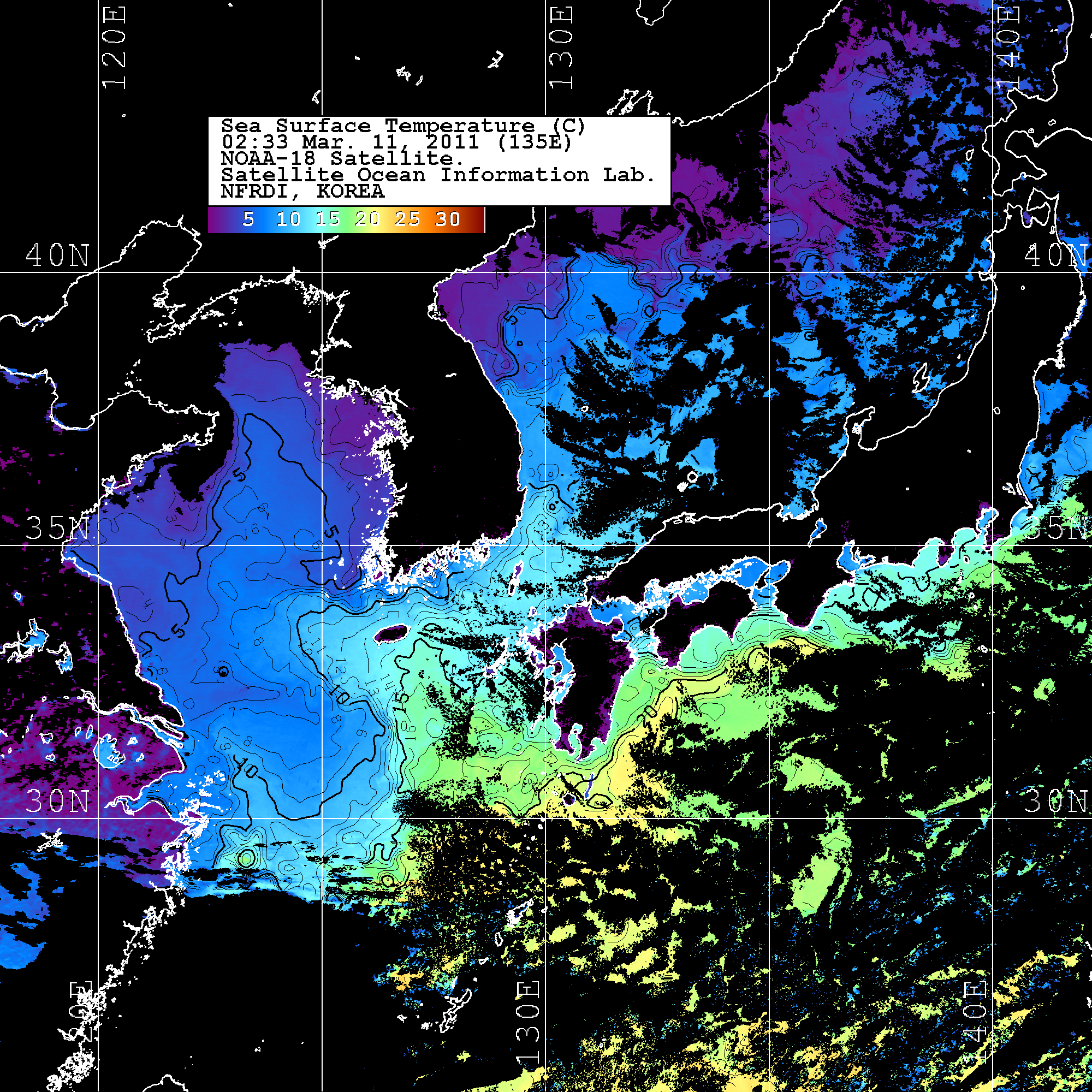 o 2011년 03월 11일 02시 33분 NOAA-18호 위성영상입니다. o 수온분포는 범례를 참고하시기 바랍니다. o 검은색은 구름을 나타냅니다. o 그림을 클릭하시면 크게 보실 수 있습니다.