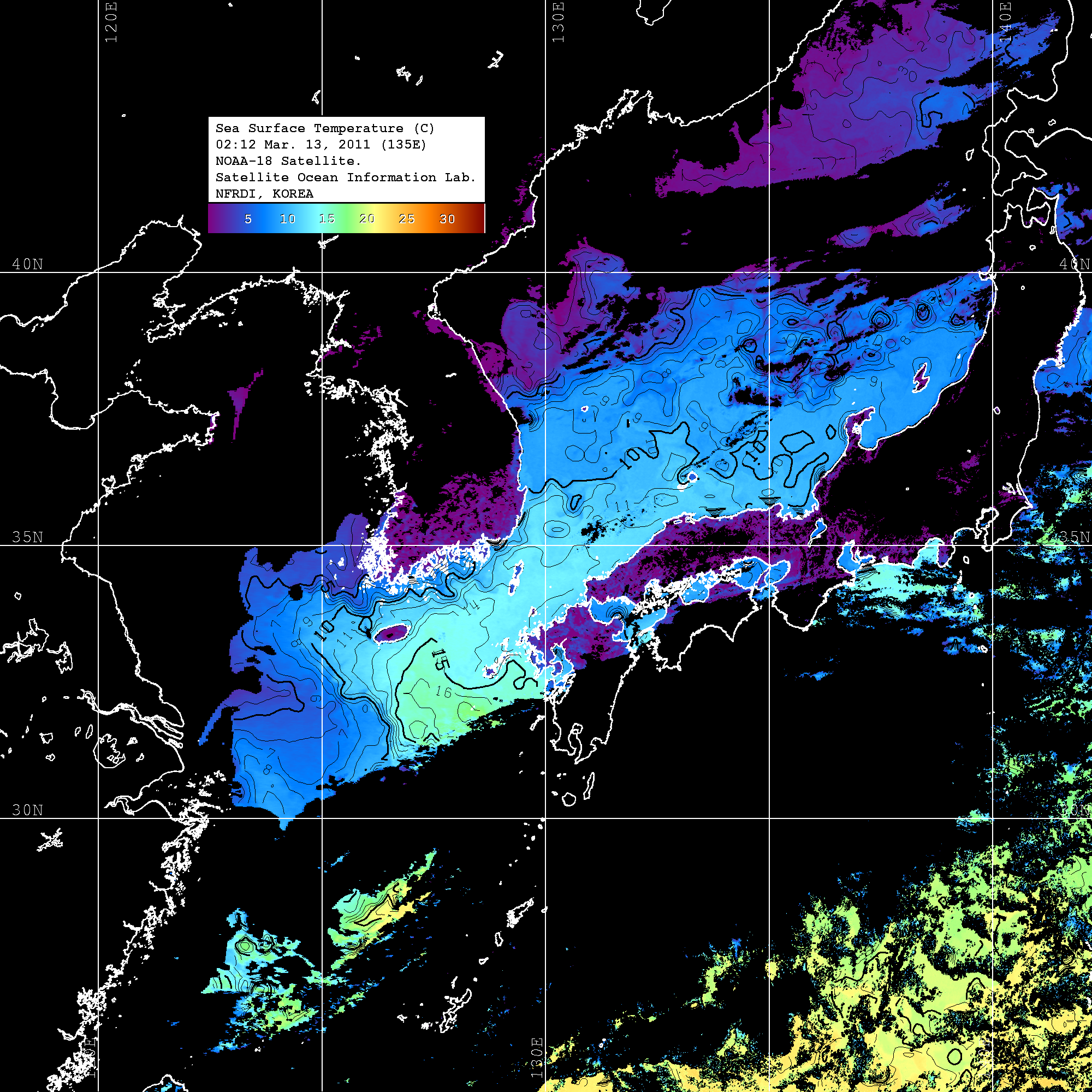 o 2011년 03월 13일 02시 12분 NOAA-18호 위성영상입니다. o 수온분포는 범례를 참고하시기 바랍니다. o 검은색은 구름을 나타냅니다. o 그림을 클릭하시면 크게 보실 수 있습니다.