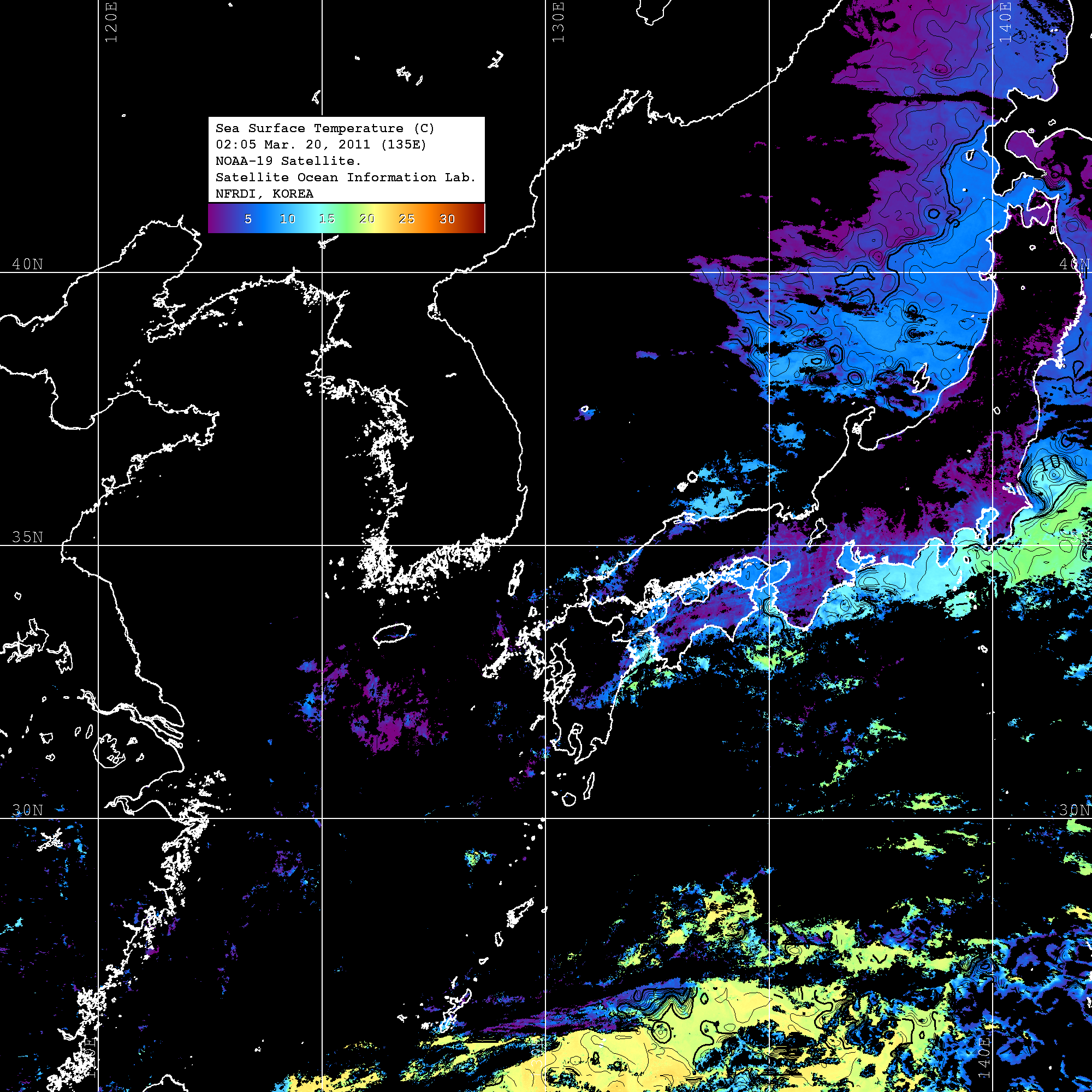 o 2011년 03월 20일 02시 05분 NOAA-19호 위성영상입니다. o 수온분포는 범례를 참고하시기 바랍니다. o 검은색은 구름을 나타냅니다. o 그림을 클릭하시면 크게 보실 수 있습니다.