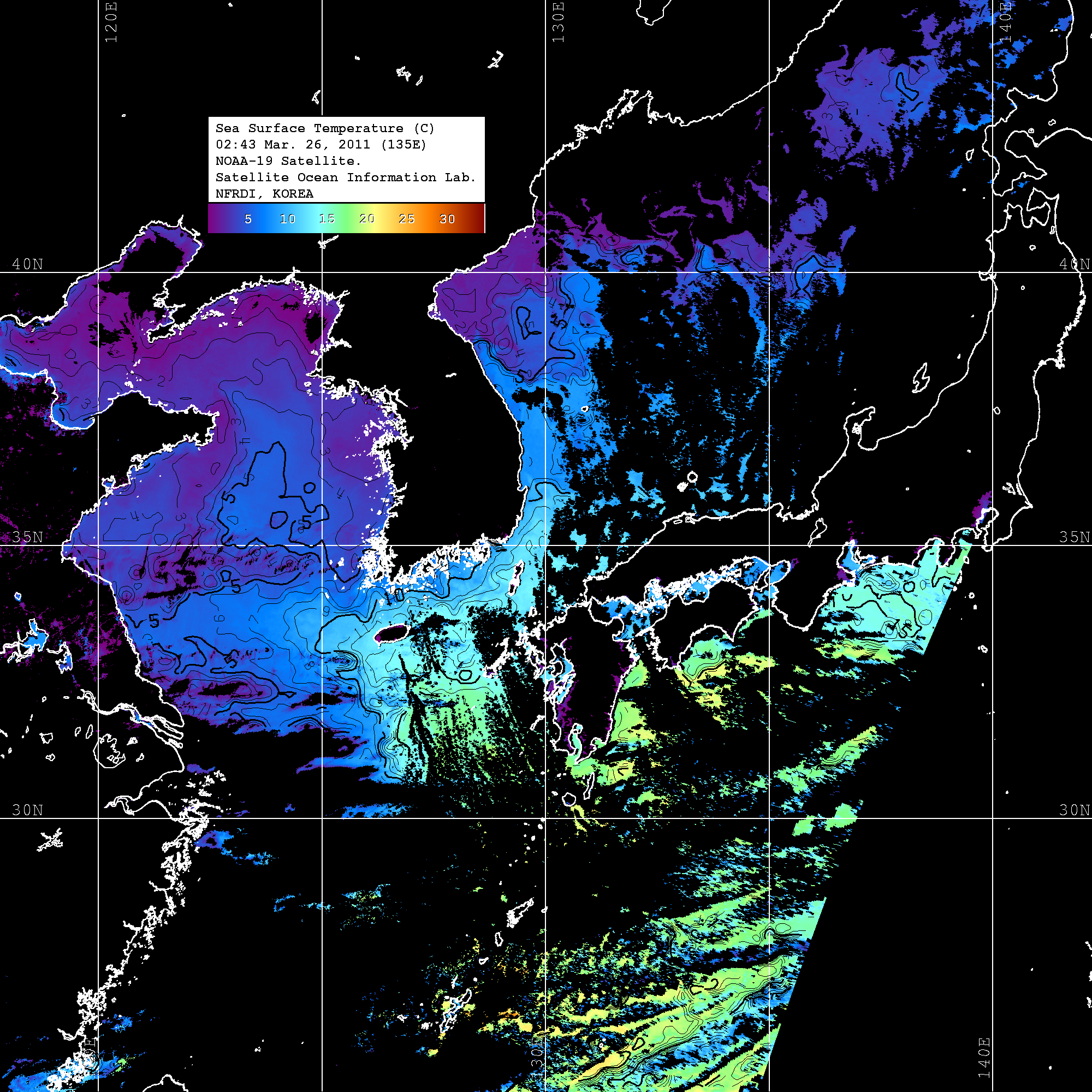 o 2011년 03월 26일 02시 43분 NOAA-19호 위성영상입니다. o 수온분포는 범례를 참고하시기 바랍니다. o 검은색은 구름을 나타냅니다. o 그림을 클릭하시면 크게 보실 수 있습니다.