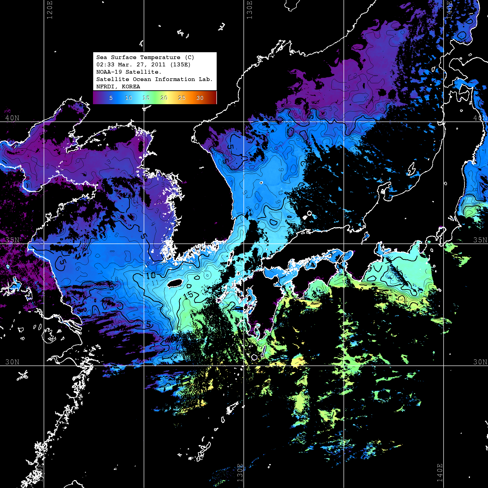 o 2011년 03월 27일 02시 33분 NOAA-19호 위성영상입니다. o 수온분포는 범례를 참고하시기 바랍니다. o 검은색은 구름을 나타냅니다. o 그림을 클릭하시면 크게 보실 수 있습니다.