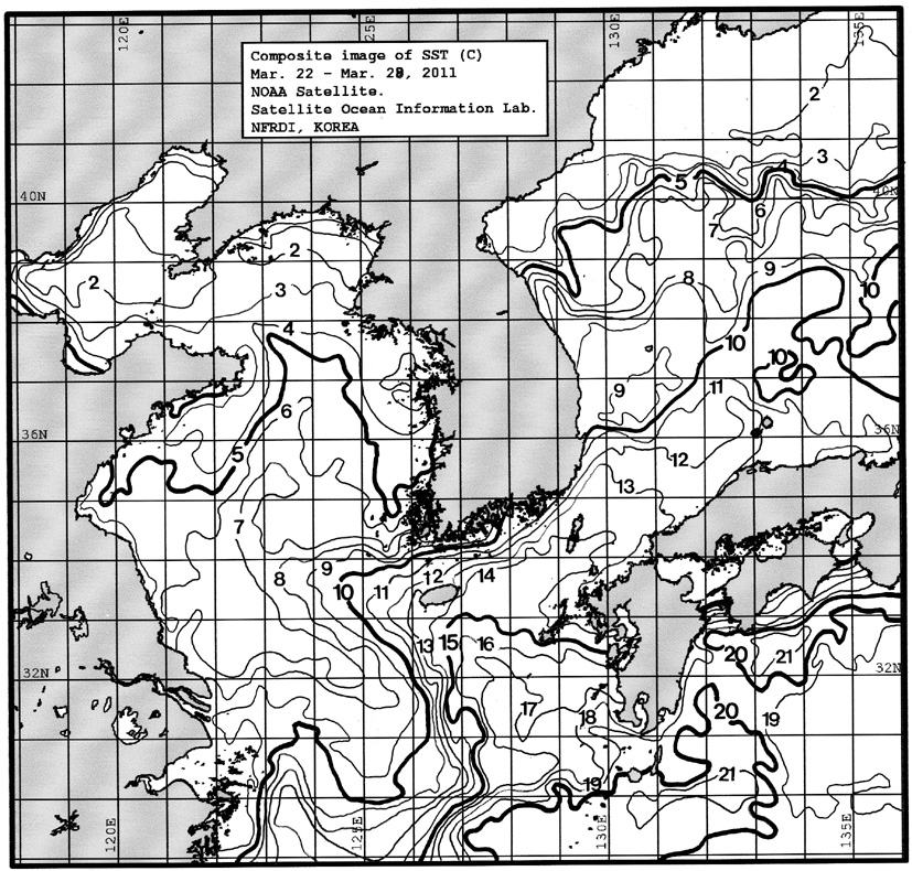 o 금주(2011.03.22~2011.03.28)의 한국근해 표면수온은 대화퇴 근해 8~10도, 울릉도 근해 9~10도, 대마도 근해 13~15도, 제주도 근해 12~14도, 이어도 근해 7~8도, 가거초 근해 9~10도, 어청도 근해 4~5도로 나타납니다. o「평년에 비해」대화퇴 근해 1.1도 높게, 울릉도 근해 0.8도 낮게, 대마도 근해 0.3도 낮게, 제주도 근해 1.2도 낮게, 이어도 근해 2.5도 낮게, 가거초 근해 0.3도 높게, 어청도 근해는 1.2도 낮게 나타납니다. o「전년에 비해」대화퇴 근해 0.5도 높게, 울릉도 근해 비슷하게, 대마도 근해 0.5도 낮게, 제주도 근해 2.0도 낮게, 이어도 근해 2.5도 낮게, 가거초 근해 1.5도 낮게, 어청도 근해는 2.0도 낮게 나타납니다. o 수온 전선대는 우리나라 제주해협에서 대한해협까지 12도를 중심으로 형성됩니다.