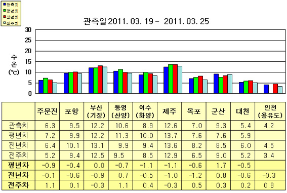 o 금주(2011.03.19~2011.03.25)의 한반도 연안 표면수온은 동해 연안역에서 섭씨 6.0~12.5도, 남해 연안역 8.5~13.0도, 서해 연안역에서 4.0~9.5도로 나타납니다. o 평년에 비해 부산(기장) 비슷함을 제외한 동해 연안역은 0.5~1.0도 낮게, 남해 연안역은 0.5~1.5도 낮게, 군산 1.7도 높음을 제외한 서해 연안역은 0.5도 낮게 나타납니다. o 전년에 비해 주문진 비슷함을 제외한 동해 연안역은 0.5~1.0도 낮게, 통영(산양) 0.7도 높음을 제외한 남해 연안역은 0.5~1.0도 낮게, 군산 0.8도 높음을 제외한 서해 연안역은 0.5~1.5도 낮게 나타납니다.