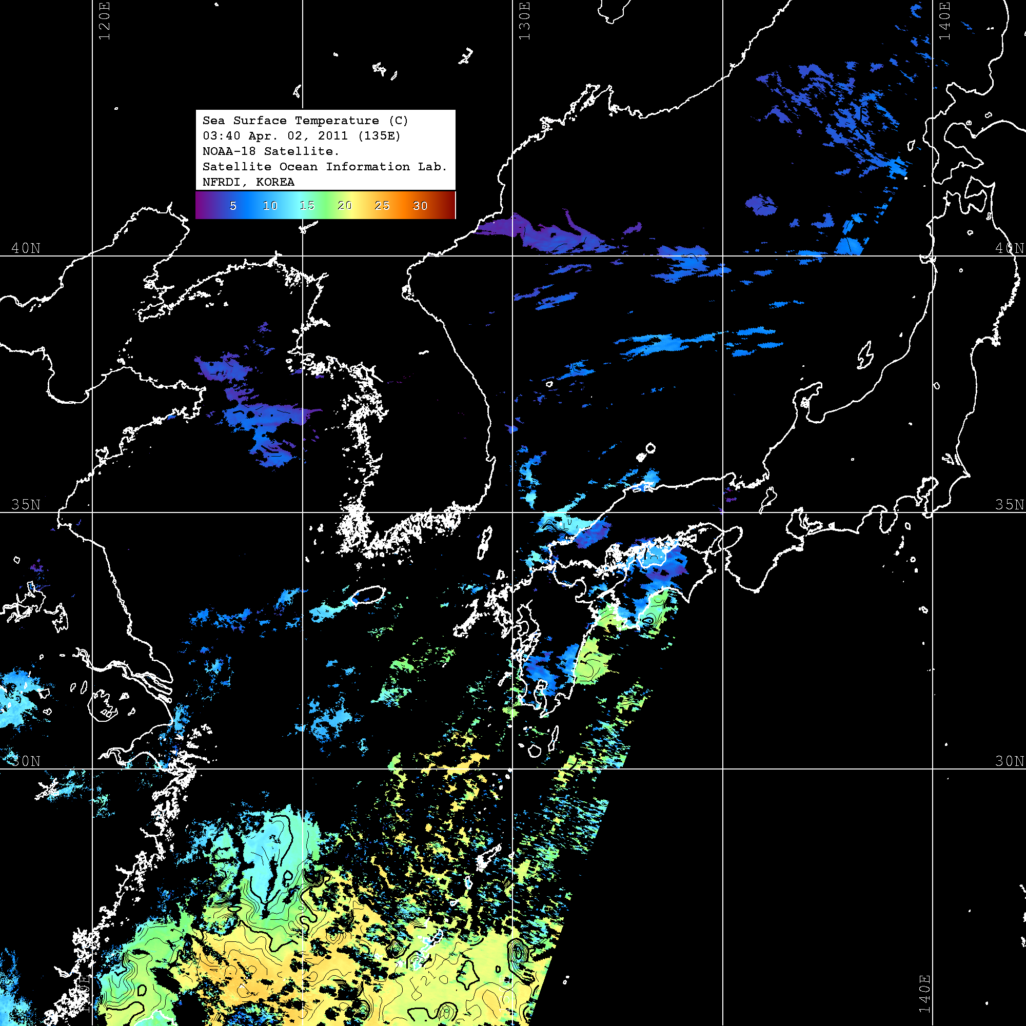 o 2011년 04월 02일 03시 40분 NOAA-18호 위성영상입니다. o 수온분포는 범례를 참고하시기 바랍니다. o 검은색은 구름을 나타냅니다. o 그림을 클릭하시면 크게 보실 수 있습니다.