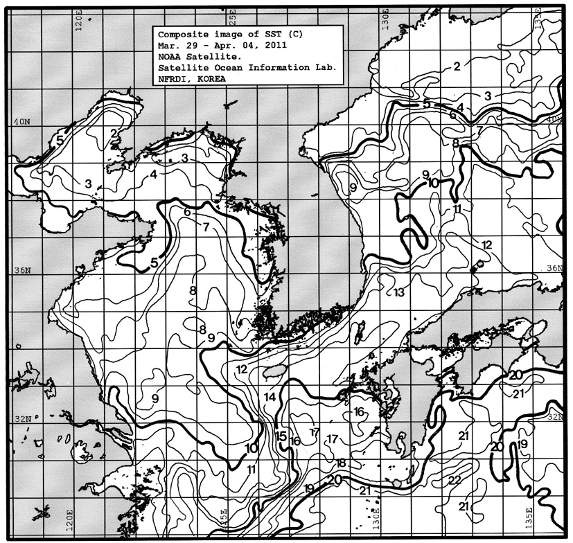 o 금주(2011.03.29~2011.04.04)의 한국근해 표면수온은 대화퇴 근해 8~9도, 울릉도 근해 9~11도, 대마도 근해 13~15도, 제주도 근해 13~14도, 이어도 근해 9~10도, 가거초 근해 9~11도, 어청도 근해 5~6도로 나타납니다. o「평년에 비해」대화퇴 근해 0.9도 높게, 울릉도 근해 비슷하게, 대마도 근해 0.4도 낮게, 제주도 근해 0.7도 낮게, 이어도 근해 1.0도 낮게, 가거초 근해 0.6도 높게, 어청도 근해는 1.4도 낮게 나타납니다. o「전년에 비해」대화퇴 근해 0.5도 높게, 울릉도 근해 1.5도 낮게, 대마도 근해 1.0도 높게, 제주도 근해 0.5도 높게, 이어도 근해 1.0도 높게, 가거초 근해 0.5도 높게, 어청도 근해는 1.5도 낮게 나타납니다. o 수온 전선대는 우리나라 제주해협에서 대한해협까지 12도를 중심으로 형성됩니다.