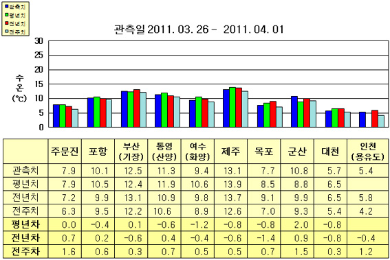 o 금주(2011.03.26~2011.04.01)의 한반도 연안 표면수온은 동해 연안역에서 섭씨 7.5~12.5도, 남해 연안역 9.0~13.5도, 서해 연안역에서 5~11도로 나타납니다. o 평년에 비해 포항 0.4도 낮음을 제외한 동해 연안역은 비슷하게, 남해 연안역은 0.5~1.5도 낮게, 군산 2도 높음을 제외한 서해 연안역은 0.5~1.0도 낮게 나타납니다. o 전년에 비해 부산(기장) 0.6도 낮음을 제외한 동해 연안역은 0.5~1.0도 높게, 통영(산양) 0.4도 높음을 제외한 남해 연안역은 0.5~1.0도 낮게, 군산 0.9도 높음을 제외한 서해 연안역은 0.5~1.5도 낮게 나타납니다.