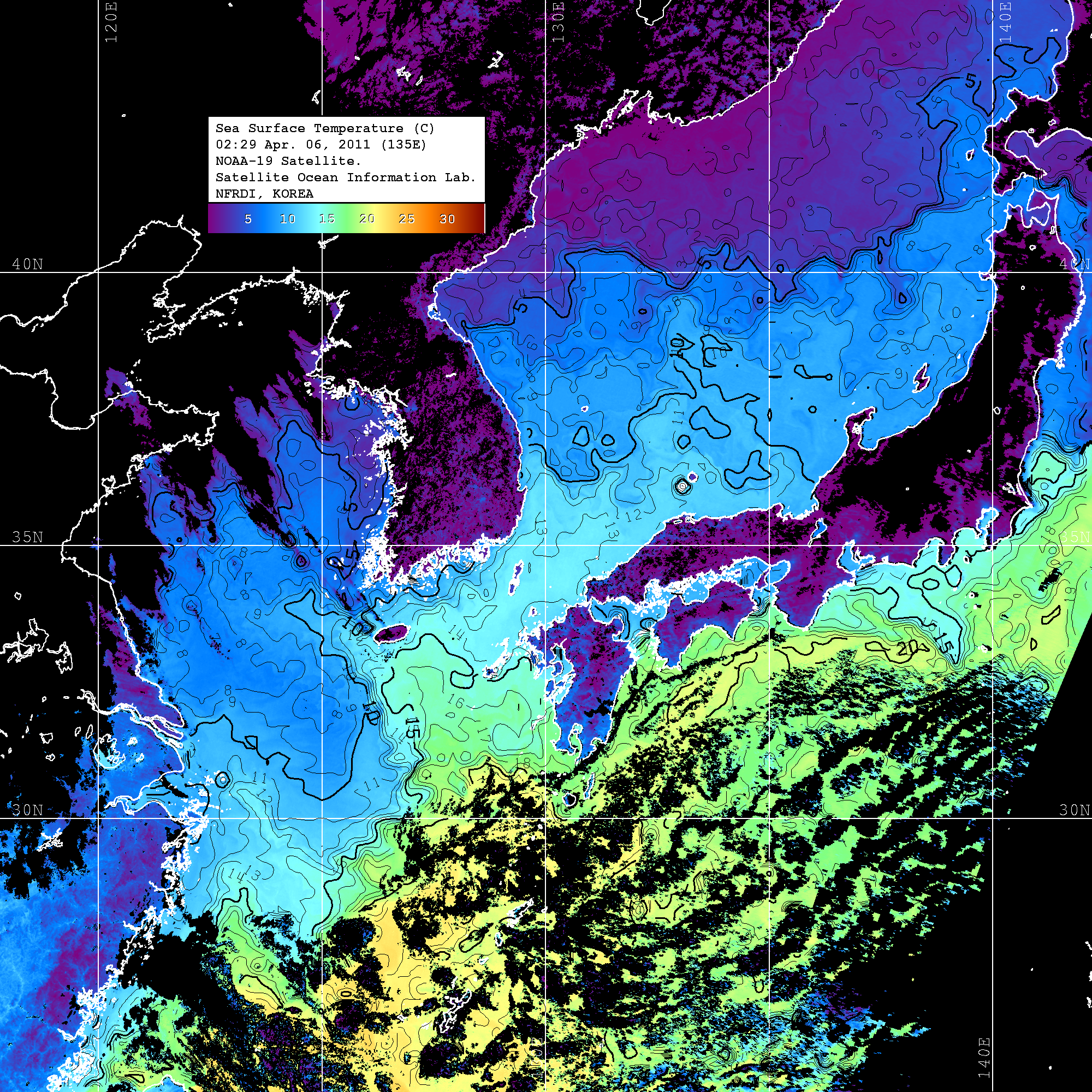 o 2011년 04월 06일 02시 29분 NOAA-19호 위성영상입니다. o 수온분포는 범례를 참고하시기 바랍니다. o 검은색은 구름을 나타냅니다. o 그림을 클릭하시면 크게 보실 수 있습니다.
