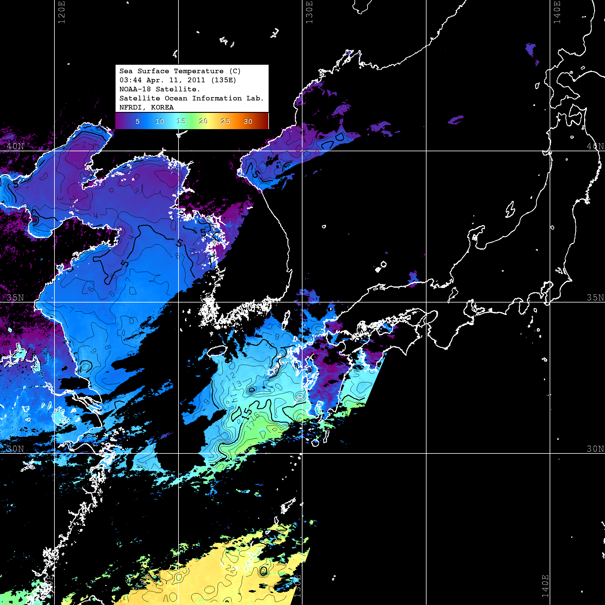 o 2011년 04월 11일 03시 44분 NOAA-18호 위성영상입니다. o 수온분포는 범례를 참고하시기 바랍니다. o 검은색은 구름을 나타냅니다. o 그림을 클릭하시면 크게 보실 수 있습니다.