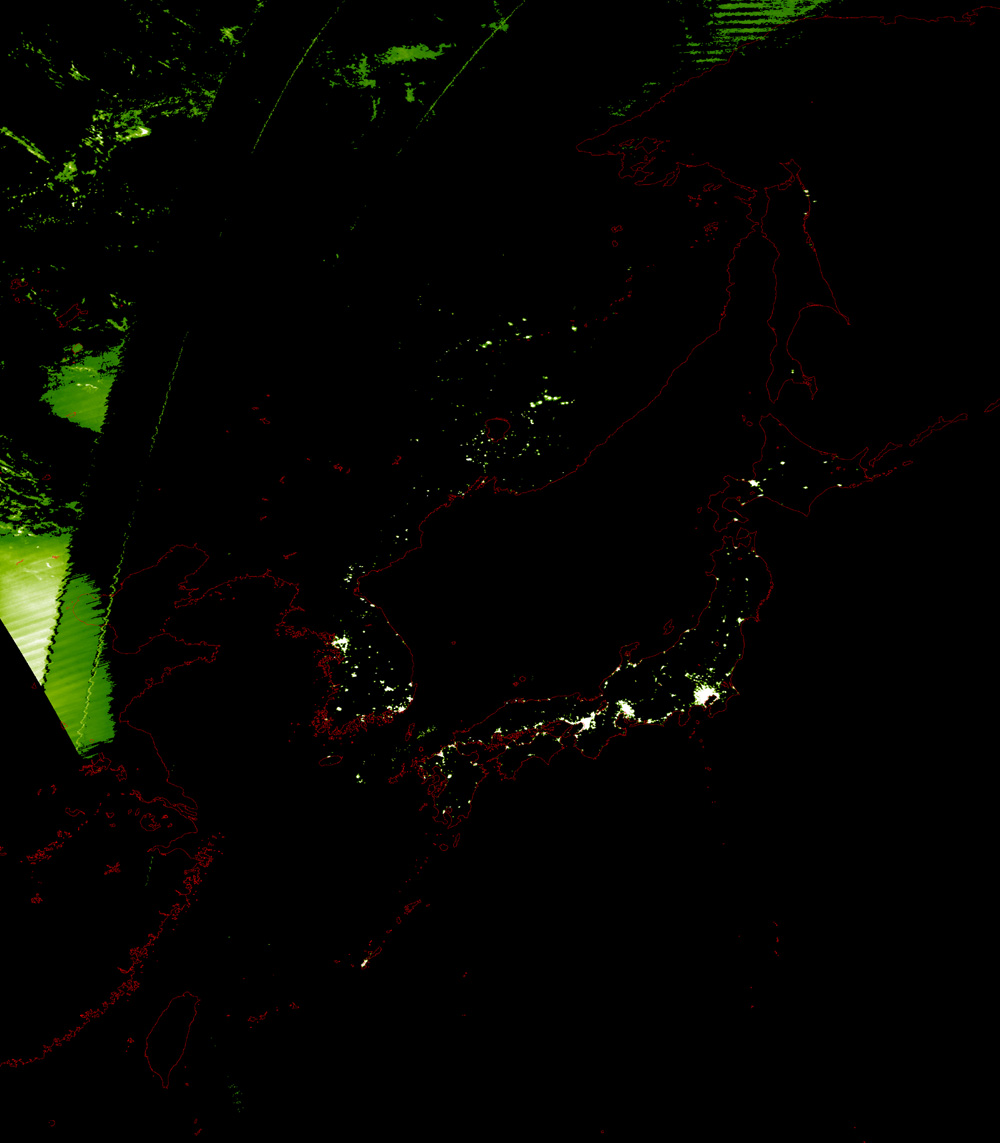 o 2011년 04월 12일 19시 40분 DMSP/OLS(Detense Meteorological Satellite Program/Operating Linescan System) 영상입니다. o DMSP/OLS는 야간 불빛을 탐지하는 위성으로, 야간 조업 어선 분포 현황을 알 수 있습니다. o 그림을 클릭하시면 크게 보실 수 있습니다.