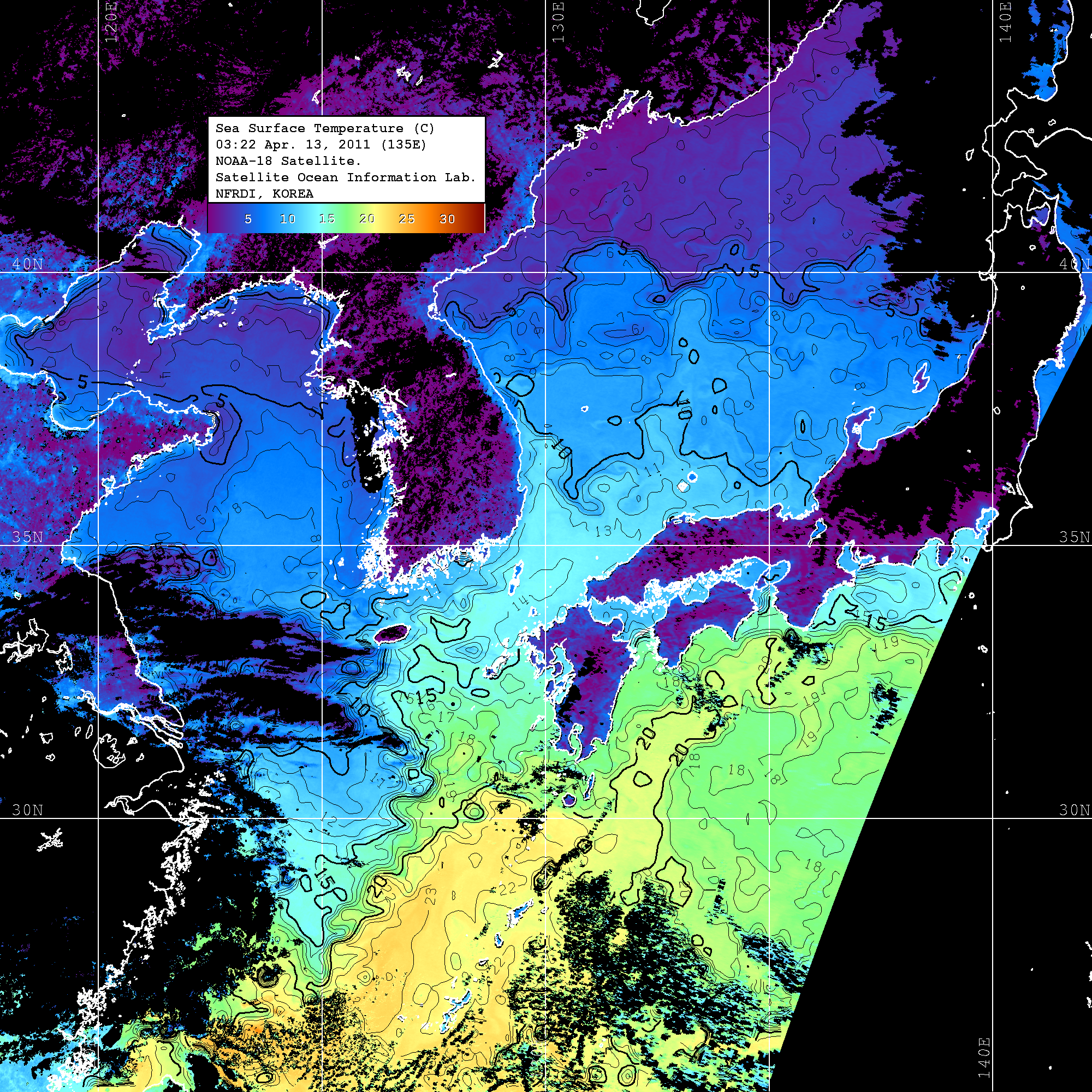 o 2011년 04월 13일 03시 22분 NOAA-18호 위성영상입니다. o 수온분포는 범례를 참고하시기 바랍니다. o 검은색은 구름을 나타냅니다. o 그림을 클릭하시면 크게 보실 수 있습니다.