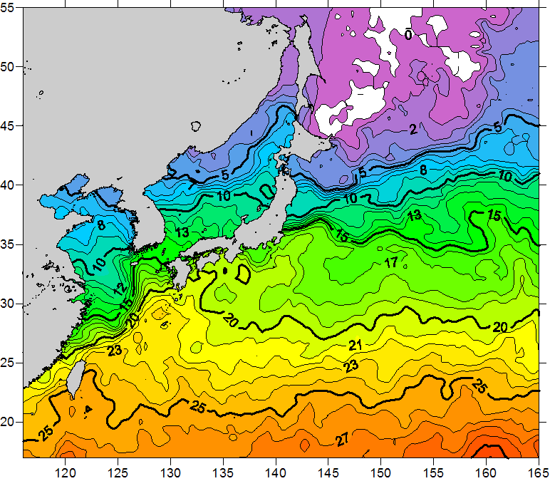 o 2011년 04월 13일 북서태평양 광역해양 수온분포 입니다. o 아래 위성 수온분포도는 국립수산과학원(NFRDI, Korea)과 일본동북대학교 (Tohoku University, Japan)가 공동연구개발 진행중, 1차 연구결과인 것으로 구름의 영향을 배제한 신기술의 수온정보입니다.