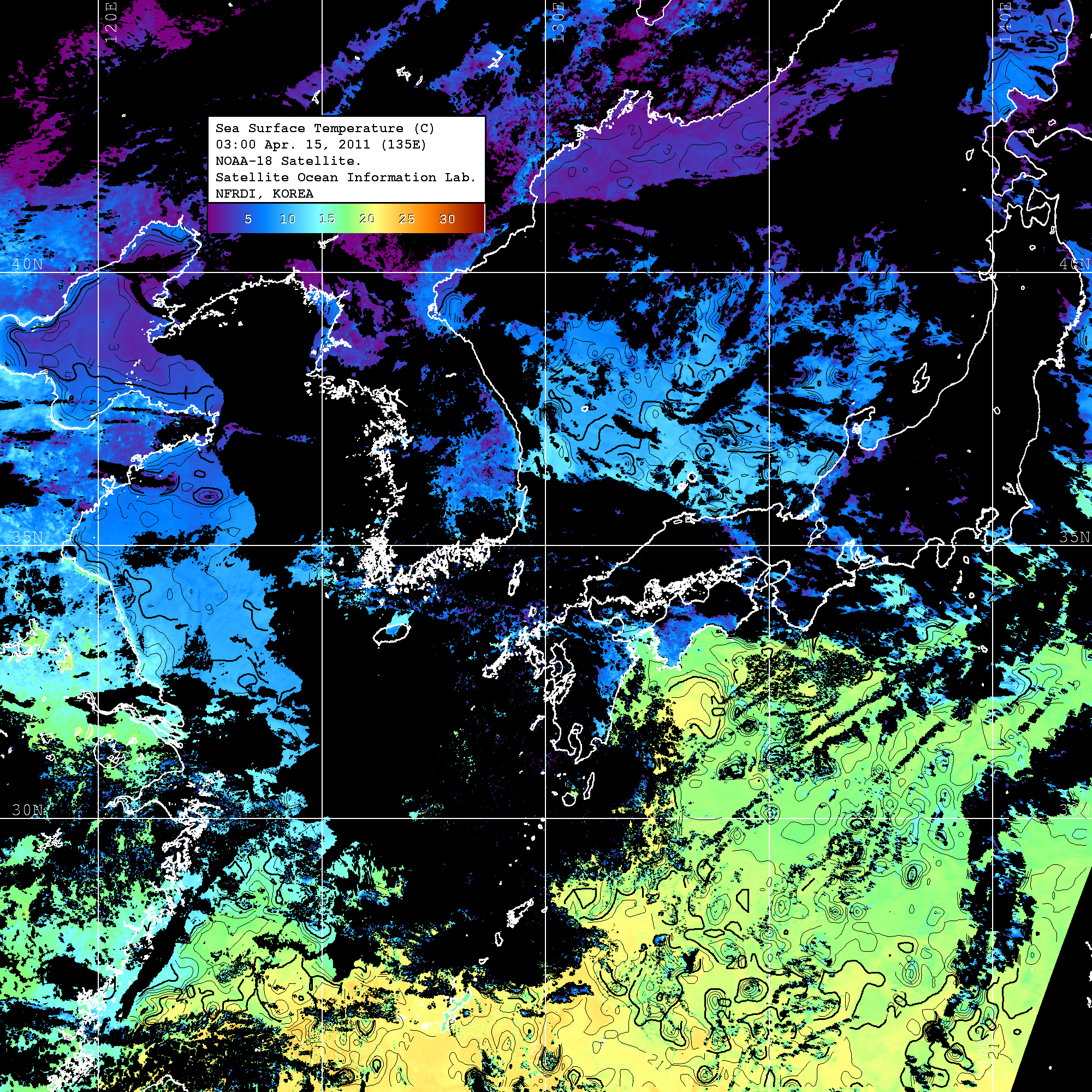 o 2011년 04월 15일 03시 00분 NOAA-18호 위성영상입니다. o 수온분포는 범례를 참고하시기 바랍니다. o 검은색은 구름을 나타냅니다. o 그림을 클릭하시면 크게 보실 수 있습니다.