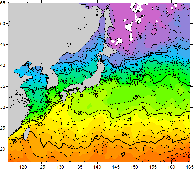 o 2011년 04월 16일 북서태평양 광역해양 수온분포 입니다. o 아래 위성 수온분포도는 국립수산과학원(NFRDI, Korea)과 일본동북대학교 (Tohoku University, Japan)가 공동연구개발 진행중, 1차 연구결과인 것으로 구름의 영향을 배제한 신기술의 수온정보입니다.