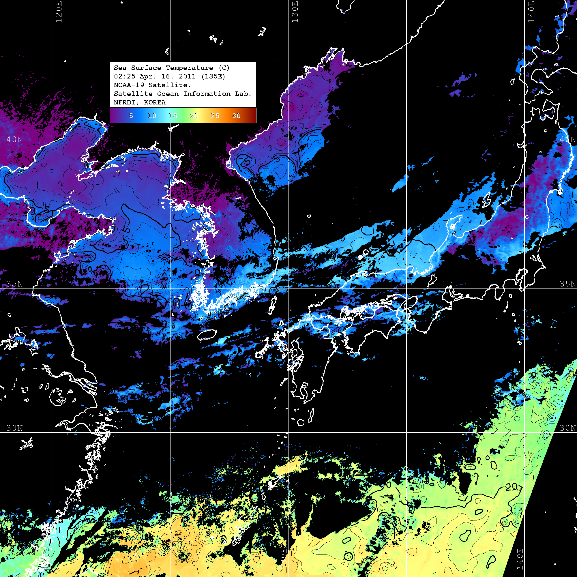 o 2011년 04월 16일 02시 25분 NOAA-19호 위성영상입니다. o 수온분포는 범례를 참고하시기 바랍니다. o 검은색은 구름을 나타냅니다. o 그림을 클릭하시면 크게 보실 수 있습니다.