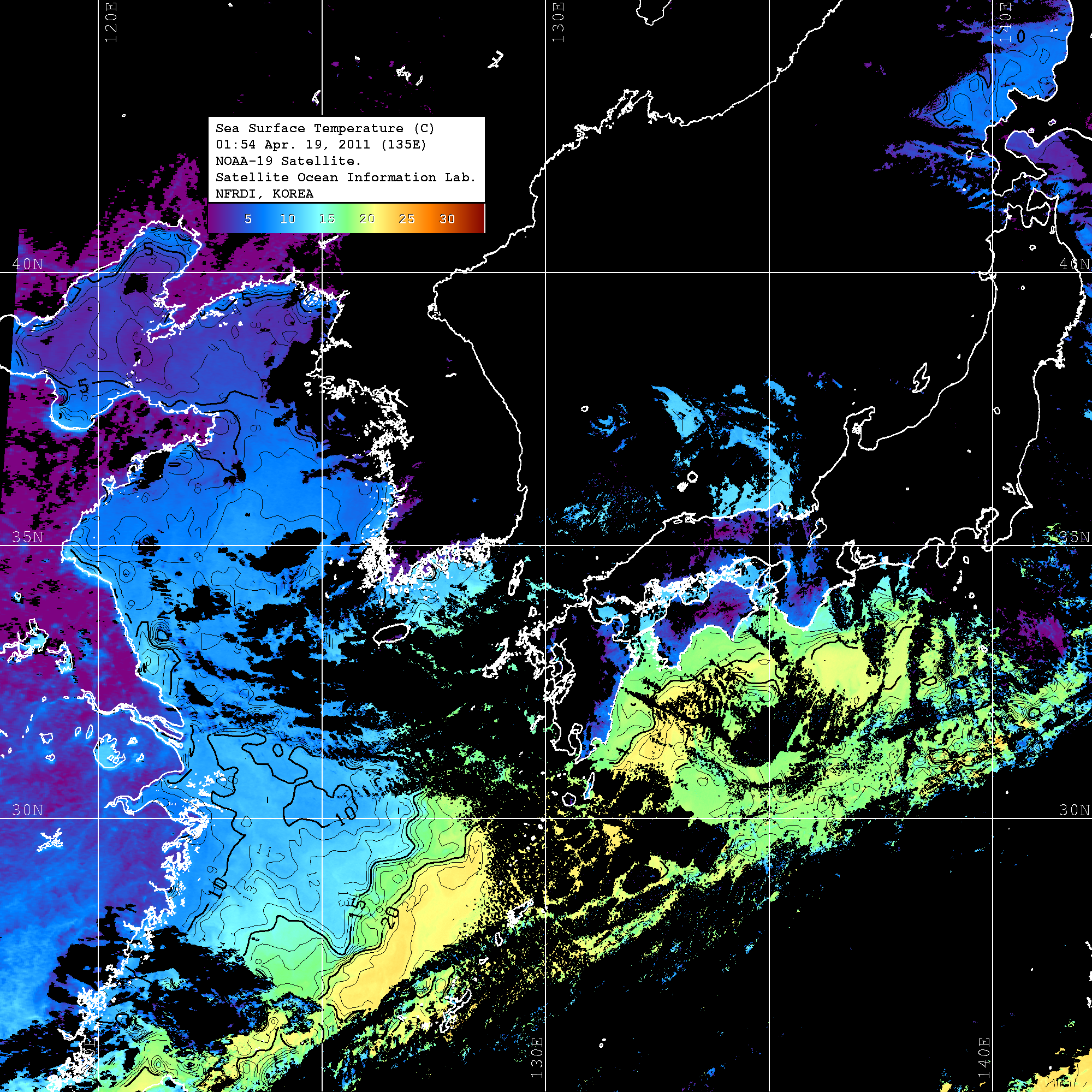 o 2011년 04월 19일 01시 54분 NOAA-19호 위성영상입니다. o 수온분포는 범례를 참고하시기 바랍니다. o 검은색은 구름을 나타냅니다. o 그림을 클릭하시면 크게 보실 수 있습니다.
