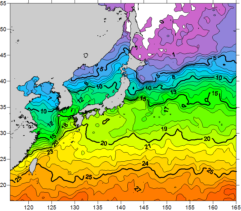 o 2011년 04월 18일 북서태평양 광역해양 수온분포 입니다. o 아래 위성 수온분포도는 국립수산과학원(NFRDI, Korea)과 일본동북대학교 (Tohoku University, Japan)가 공동연구개발 진행중, 1차 연구결과인 것으로 구름의 영향을 배제한 신기술의 수온정보입니다.