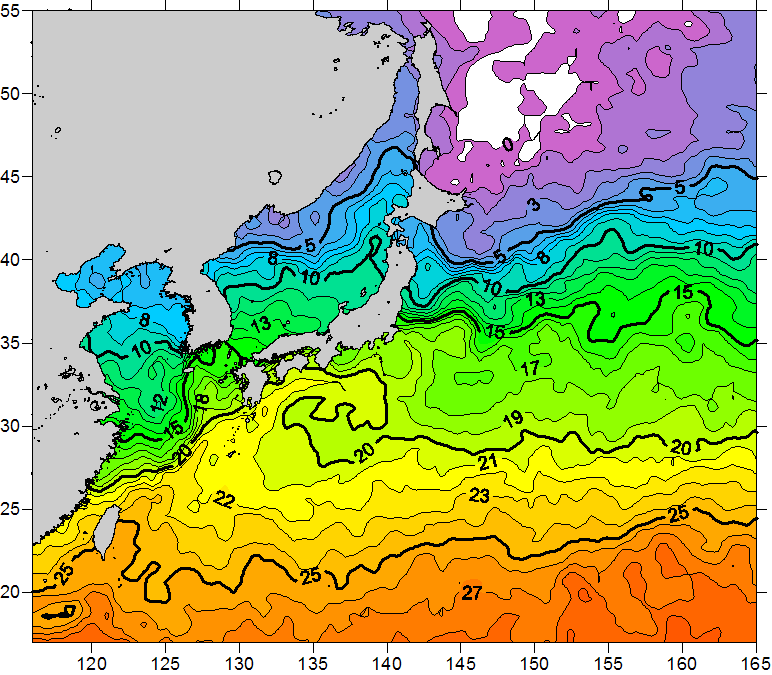 o 2011년 04월 21일 북서태평양 광역해양 수온분포 입니다. o 아래 위성 수온분포도는 국립수산과학원(NFRDI, Korea)과 일본동북대학교 (Tohoku University, Japan)가 공동연구개발 진행중, 1차 연구결과인 것으로 구름의 영향을 배제한 신기술의 수온정보입니다.