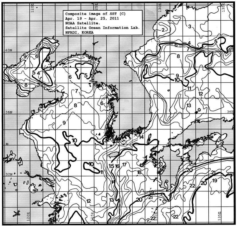 o 금주(2011.04.19~2011.04.25)의 한국근해 표면수온은 대화퇴 근해 7~8도, 울릉도 근해 10~11도, 대마도 근해 14~15도, 제주도 근해 13~15도, 이어도 근해 10~11도, 가거초 근해 10~11도, 어청도 근해 7~8도로 나타납니다. o「평년에 비해」대화퇴 근해 1.9도 낮게, 울릉도 근해 1.9도 낮게, 대마도 근해 1.1도 낮게, 제주도 근해 1도 낮게, 이어도 근해 1.8도 낮게, 가거초 근해 비슷하게, 어청도 근해는 1.1도 낮게 나타납니다. o「전년에 비해」대화퇴 근해 1도 낮게, 울릉도 근해 2도 낮게, 대마도 근해 0.5도 낮게, 제주도 근해 1도 낮게, 이어도 근해 1도 낮게, 가거초 근해 비슷하게, 어청도 근해는 0.5도 낮게 나타납니다. o 수온 전선대는 우리나라 제주해협에서 대한해협까지 13도를 중심으로 형성됩니다.