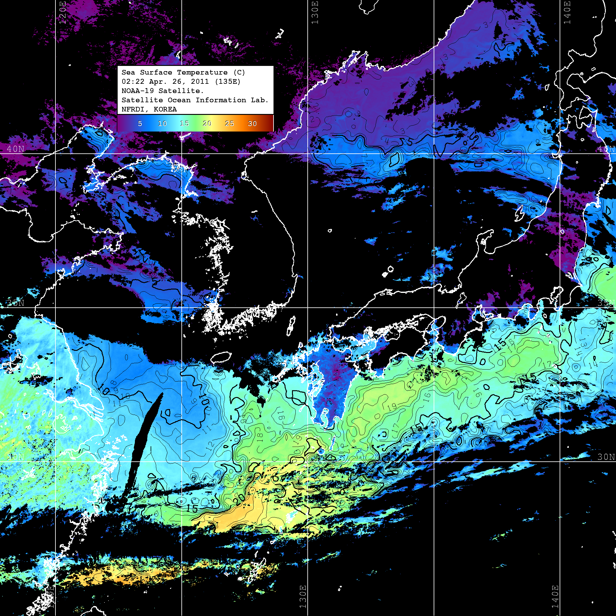o 2011년 04월 26일 02시 22분 NOAA-19호 위성영상입니다. o 수온분포는 범례를 참고하시기 바랍니다. o 검은색은 구름을 나타냅니다. o 그림을 클릭하시면 크게 보실 수 있습니다.