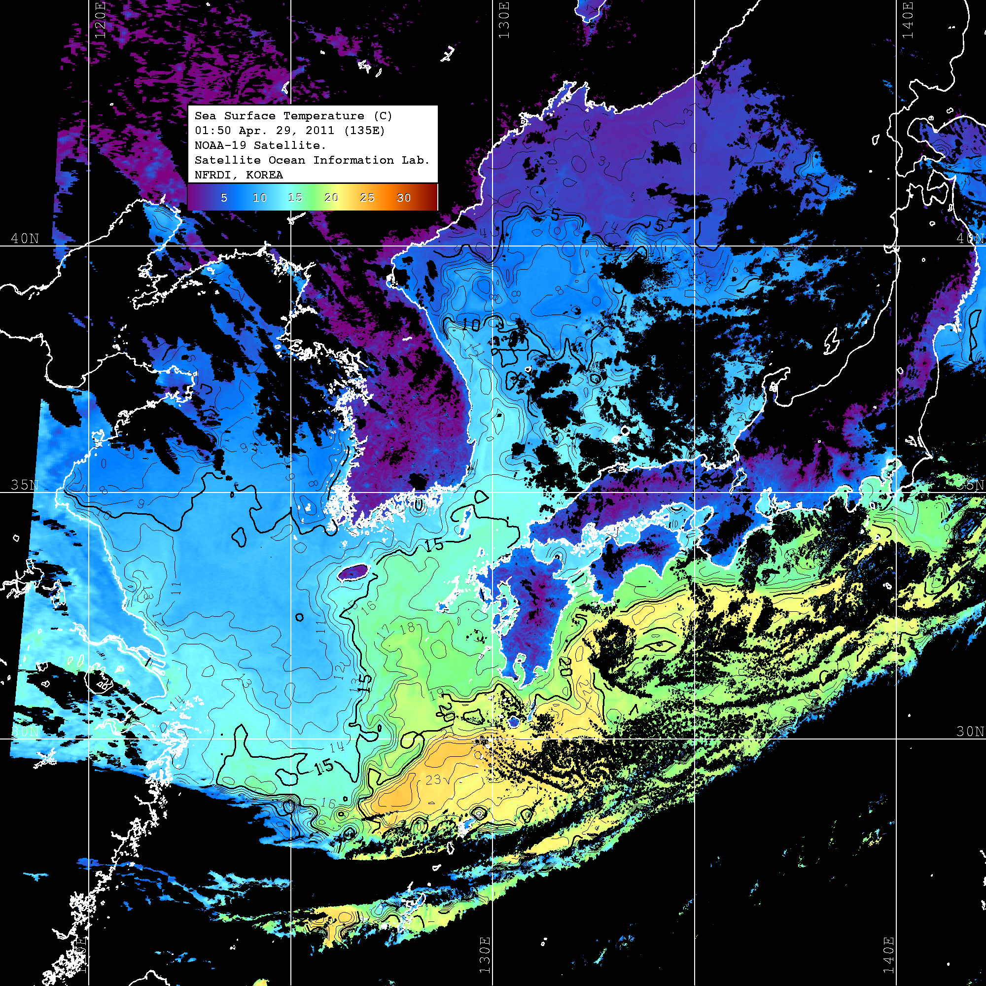 o 2011년 04월 29일 01시 50분 NOAA-19호 위성영상입니다. o 수온분포는 범례를 참고하시기 바랍니다. o 검은색은 구름을 나타냅니다. o 그림을 클릭하시면 크게 보실 수 있습니다.
