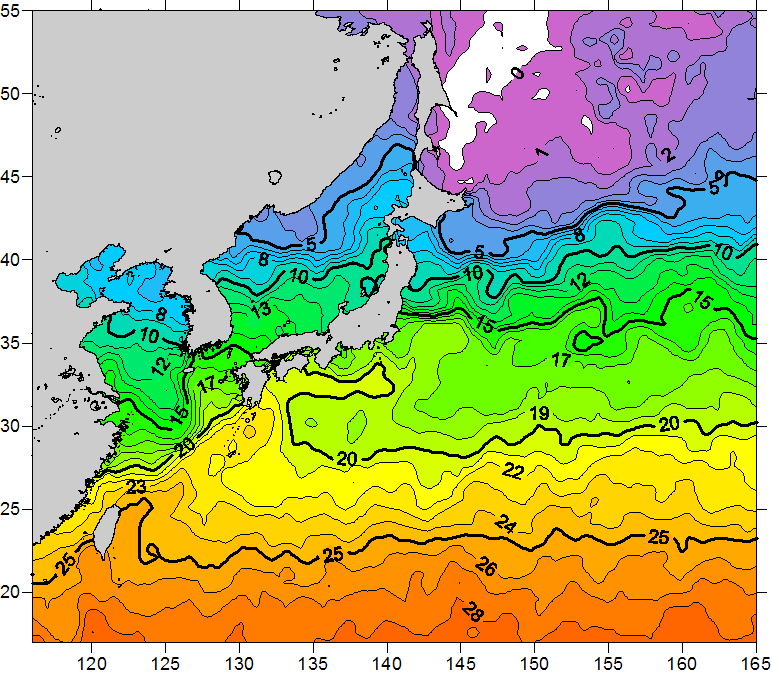 o 2011년 04월 29일 북서태평양 광역해양 수온분포 입니다. o 아래 위성 수온분포도는 국립수산과학원(NFRDI, Korea)과 일본동북대학교 (Tohoku University, Japan)가 공동연구개발 진행중, 1차 연구결과인 것으로 구름의 영향을 배제한 신기술의 수온정보입니다.