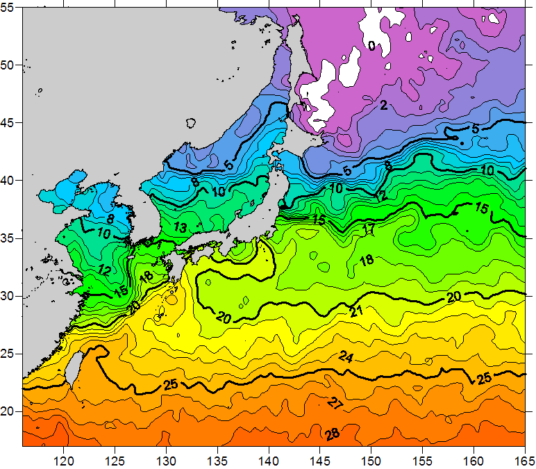 o 2011년 04월 30일 북서태평양 광역해양 수온분포 입니다. o 아래 위성 수온분포도는 국립수산과학원(NFRDI, Korea)과 일본동북대학교 (Tohoku University, Japan)가 공동연구개발 진행중, 1차 연구결과인 것으로 구름의 영향을 배제한 신기술의 수온정보입니다.