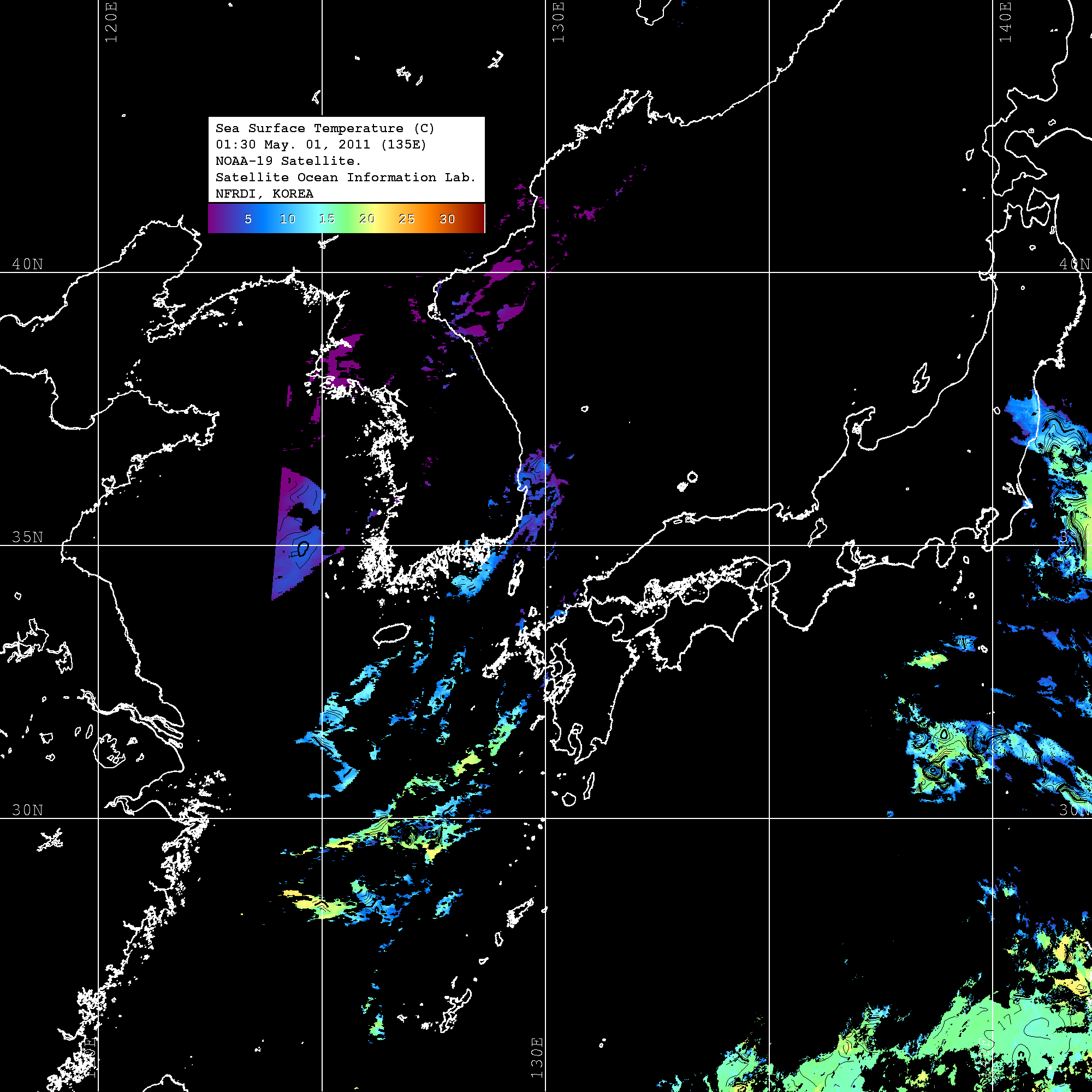 o 2011년 05월 01일 01시 30분 NOAA-19호 위성영상입니다. o 수온분포는 범례를 참고하시기 바랍니다. o 검은색은 구름을 나타냅니다. o 그림을 클릭하시면 크게 보실 수 있습니다.