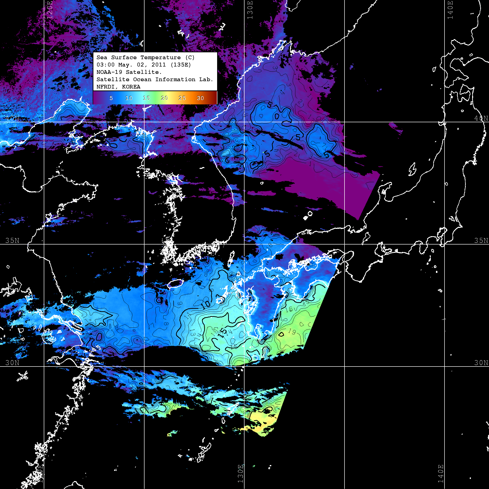 o 2011년 05월 02일 03시 00분 NOAA-19호 위성영상입니다. o 수온분포는 범례를 참고하시기 바랍니다. o 검은색은 구름을 나타냅니다. o 그림을 클릭하시면 크게 보실 수 있습니다.