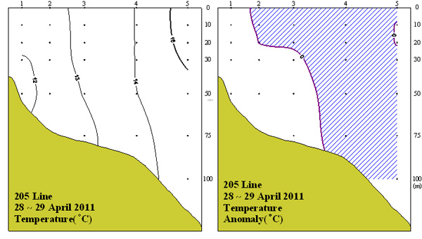 ㅇ 2011년 4월 28∼29일 국립수산과학원 남해수산연구소에서 조사한 205선(소리도 남동방)의 수직수온분포도 및 평년편차도 입니다.